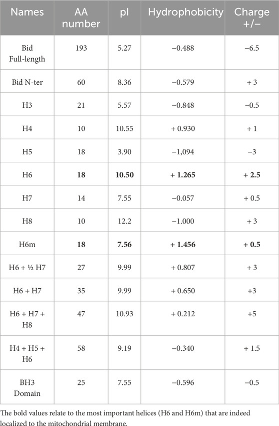 Table 1. Somes physical characteristics of Bid, tBid and tBid mutants. Various properties of the different peptide-derived from tBid, i.e., number of amino-acids, isoelectric point (pI), hydrophobility and electric charge.