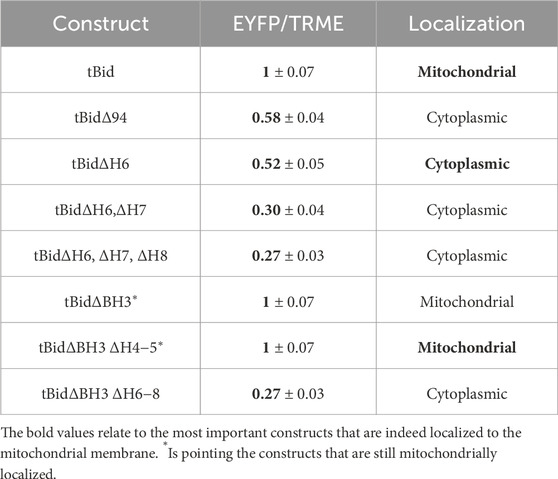 All the constructs are electropermeabilized to allow their penetration into cells. CV-1 cells were transfected with plasmids encoding BID-EYFP, tBID-EYFP or tBID-EYFP mutants in the presence of 10 μM Bok-D. After 24 h, the cells were stained with 20 nM of the mitochondrial potential probe TMRE, and the localization of the tBID-EYFP mutants was determined by calculating the TMRE/EYFP ratio via microspectroflurometry. A ratio of 1.0 indicates that EYFP colocalizes exclusively with TMRE at the mitochondria, whereas a lower ratio indicates that EYFP also localizes to the cytosol. The * marks the constructs that localize to the mitochondria but are unable to induce cytochrome c release or alter mitochondrial bioenergetics. The constructs that localize to the cytoplasm are in italics. The table is adapted and slightly modified from (Gonzalvez et al., 2010).