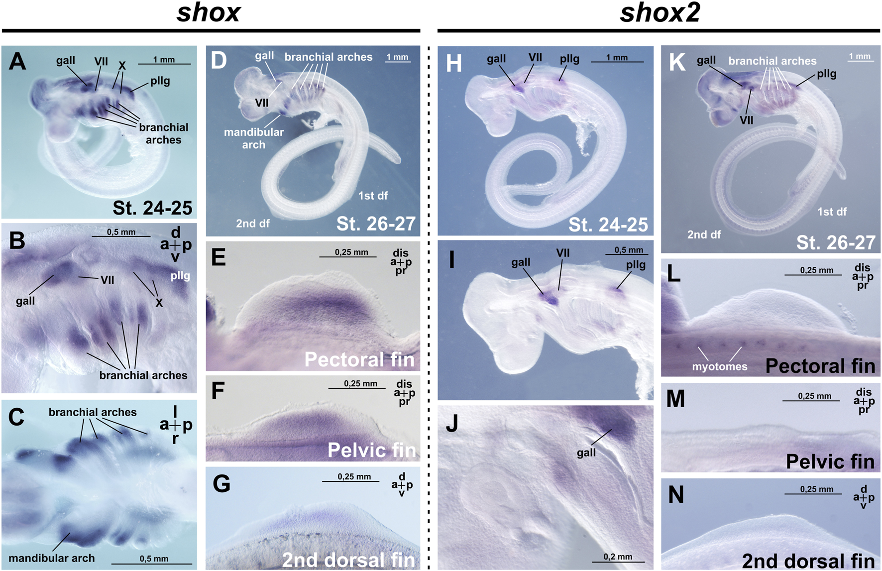 Figure 2. Expression of shox and shox2 in C. griseum embryos at stages 24–27 (after Ballard et al., 1993). gall–ganglion of the anterior lateral line; VII–ganglion of the VII nerve; X–ganglion of the X nerve, pllg–posterior lateral line ganglion. At stages 24–26, shox expression is detected in the intermediate domains of the branchial arches (A–D) the mandibular arch, cranial ganglia, as well as in the paired and second dorsal fin buds (E–G). At the same stages, shox2 is expressed in the cranial and ganglia (H–K) and in the myotomes (L). Notably, shox2 expression is absent in the paired and second dorsal fins (L–N). Expression patterns that were reproduced in at least 80% of cases were considered reliable.