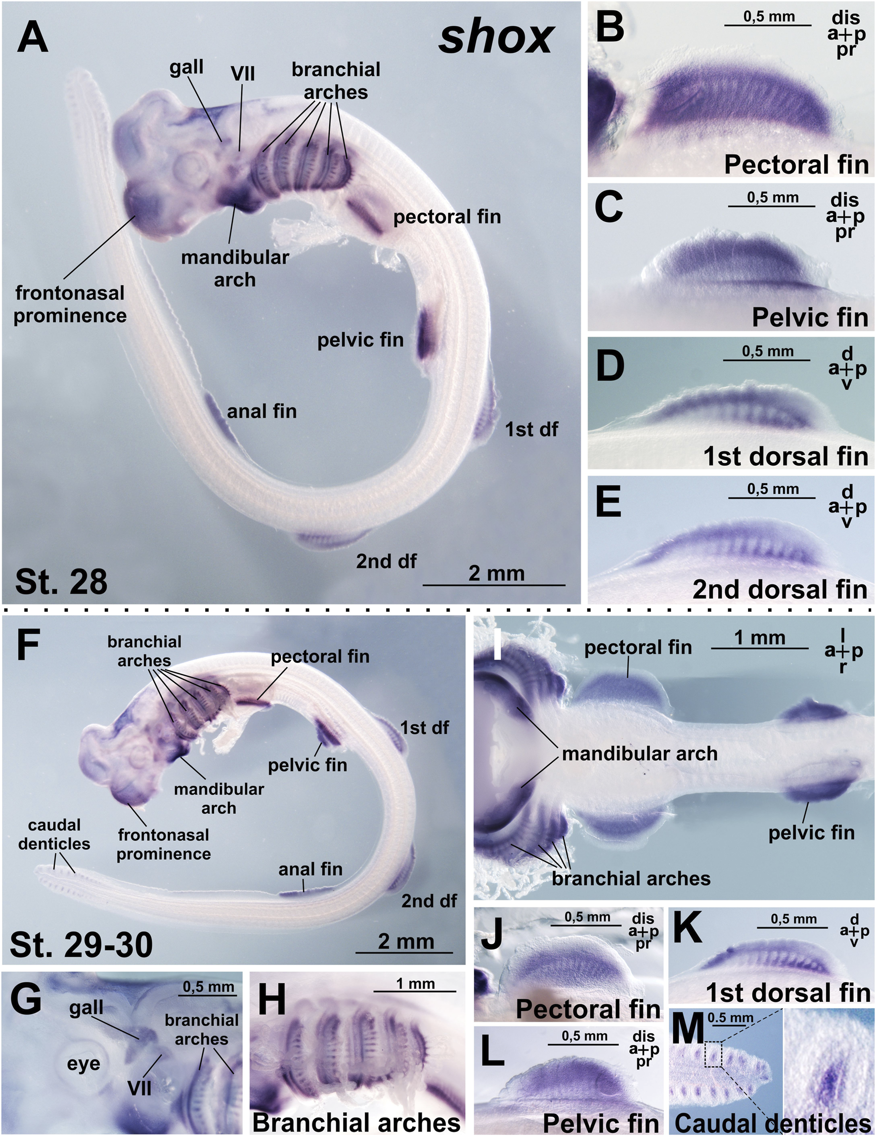 Figure 3. Expression of shox in C. griseum embryos at stages 28 (A–E) and 30 (F–M). At stages 28–30 shox expression is observed in mandibular and branchial arches, including gill rays (A,F,H,I), paired (pectoral and pelvic) (A–C,F,I,J,L) and median (dorsal and anal) (A,D,E,F,K) fins, cranial ganglia (A,G) frontonasal prominence (A,F) and caudal denticles (M). df, dorsal fin; gall, ganglion of the anterior lateral line; VII, ganglion of the VII nerve. Expression patterns that were reproduced in at least 80% of cases were considered reliable.