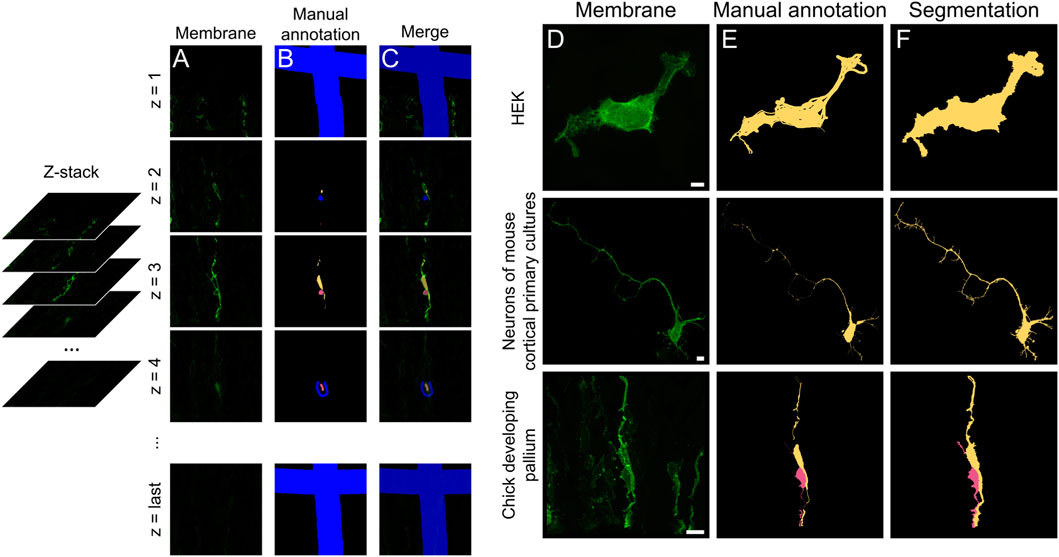 Figure 2. Semi-automated segmentation of complex cell morphologies using 3D Slicer. (A) Selected slices from the z-stack open in 3DSlicer, from first to last slice (z = 1 to z = N). (B) Partial manual annotation of individual cells and their processes performed on 2D planes. (C) Merge of annotation and membrane channels. Background is labeled in blue. To preserve the original z-stack dimensions, the first and last picture of the stack were partially annotated as background ((B,C), top and bottom). (D–F) Maximum projections of membrane channel (D), manual annotation (E) and final segmentation output (F), referred to as “Segmentation preview” in 3DSlicer. Scale bars: 5 µm.
