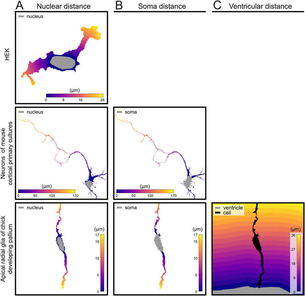 Figure 3. Distance map generation at increasing levels of biological complexity. (A) Geodesic distance from the nucleus in a HEK cell, mouse cortical progenitor cell and apical Radial Glia Cell from the developing chick pallium. (B) Distance from soma in mouse cortical progenitor cells and chick apical Radial Glia Cell. (C) Distance from ventricle of apical Radial Glia Cells from the developing chick pallium. Gray area in each distance map indicates the reference structure used to measure distance. Geodesic distance was used for nuclear and soma-based maps; Euclidean distance was used for ventricular distance calculations.