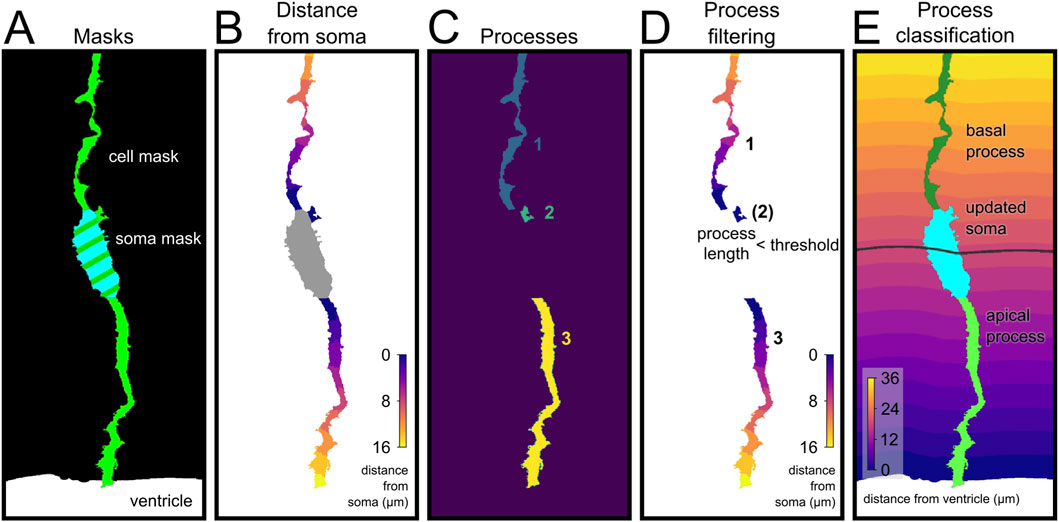 Figure 4. Automated annotation and classification of apical radial glia compartments. (A) Segmentation masks showing the cell (green), soma (cyan) and ventricle (white). (B) Geodesic distance from the soma (μm), used to define the length of each process. (C) Separate cellular components connected to the soma (each assigned to a numeric id). (D) The maximum distance from soma is used to calculate the length of the processes; short processes (<2 μm, number in bracket) were excluded from further analysis and reassigned to the soma. (E) Final classification of basal and apical processes. The short processes have been combined with the soma to obtain an updated soma. The soma distance from the ventricle (gray line) is used to classify the processes as apical or basal depending on the position of their attachment to the soma.