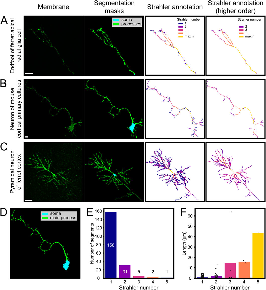Figure 5. Automated skeletonization and branch analysis of neuronal and glial cells. Automated skeletonization and branch analysis of neurons and glia using the MitoLandscape pipeline. (A–C) Representative examples: (A) Ferret apical radial glia, (B) mouse cortical neuron in vitro, and (C) adult ferret pyramidal neuron (extracted from Borrell and Callaway (2002)); each showing membrane fluorescence, segmentation masks (soma/processes), and Strahler-order color-coded skeletons. (D) Soma and main process identification for compartmental analysis (mouse neuron from (B)). For ferret apical radial glia, the most proximal portion of the endfoot was annotated as root for the Strahler analysis. (E,F) Strahler analysis reveals abundant short terminal branches (order 1) and fewer, longer proximal segments of higher order. Scale bars, 10 μm (A,B); 50 μm (C).