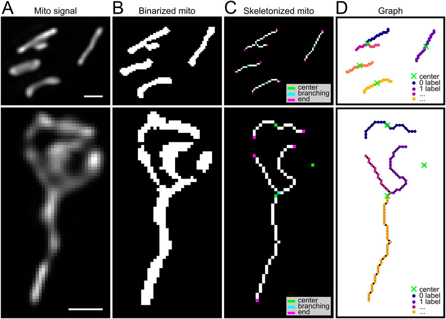 Figure 6. Mitochondrial skeletonization and graph-based analysis, example from chick developing pallium. (A) Raw Airyscan super-resolution microscopy images were deconvolved using Huygens software (Mito signal), maximum projection. (B) Maximum projection of binarized mitochondria was generated by a two-class pixel classification model in ilastik (Binarized mito). (C) Skeletonized representation showing endpoints (1 neighbor; magenta), branching points (more than 2 neighbors; cyan) and centers (green) for each mitochondrial element, calculated as barycenter of each mitochondrial element, treated as a graph where every voxel is a node connected to the neighbors. (D) Graph representation of mitochondria, green crosses indicate element centers, colors represent the single linear components (or branches). Scale bar, 0.5 μm.