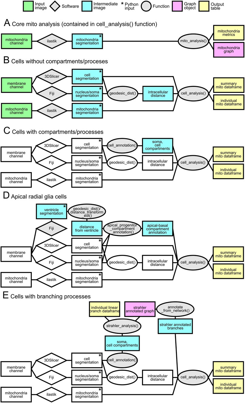 Figure 7. Schematic of analysis pipelines. Rectangles denote images or data products: green, input images (e.g., deconvolved acquisitions); blue, intermediate images required by the pipeline; pink, graph objects (NetworkX); yellow, output tables. Star marks the images used as input to the Python scripts. Steps invariant relative to the baseline pipeline (cells without compartment/process annotations) are shown in white. Gray rhombuses indicate third-party software used for manual or semi-automated segmentation; gray ellipses indicate in-house Python functions used within the pipeline. Panels: (A) core mitochondrial analysis—segmentation-derived, graph-based quantification; (B) basic cell analysis using nucleus/soma distance only; (C) analysis of cells with soma-derived compartments or other compartment annotations; (D) dedicated pipeline for apical radial glia exhibiting apico–basal polarity; (E) analysis of branching morphologies and associated compartments.
