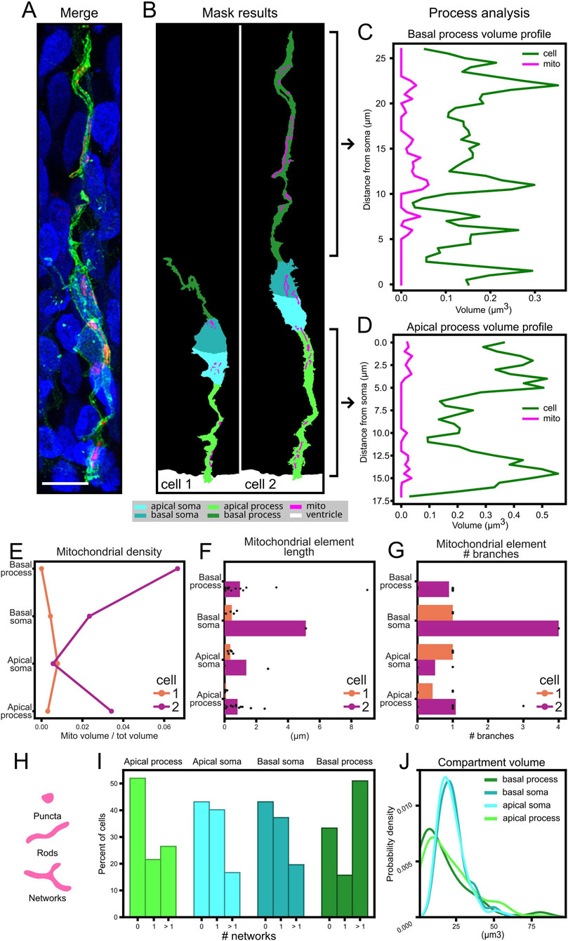 Figure 8. Comprehensive analysis of mitochondrial morphology and distribution. (A) Merged image showing membrane (green), mitochondria (magenta), and nuclei (blue) in an apical radial glia cell from chick developing pallium. (B) Segmentation masks identifying cell compartments in two cells of interest: apical/basal part of the somas and processes (cyan, magenta, light and dark green), mitochondria (magenta), and ventricle (white). (C,D) Volume profiles along the basal (C) and apical (D) processes, showing mitochondrial (magenta) and process (green) volumes as a function of distance from the soma. (E) Results of the analysis of the mitochondrial density across cellular components in the two cells of interest. (F) Result of the analysis of individual mitochondrial length and their subcellular distribution in the two cells of interest. (G) Result of the analysis of individual mitochondrial number of branches and their subcellular distribution in the two cells analyzed. (H) Morphological classification of mitochondrial element (Bakare et al., 2021). (I) Result of the network content of subcellular compartments in 102 apical radial glia cells from the developing pallium. (J) Kernel density estimation (KDE) plot of subcellular compartment volumes. Scale bar, 5 μm.