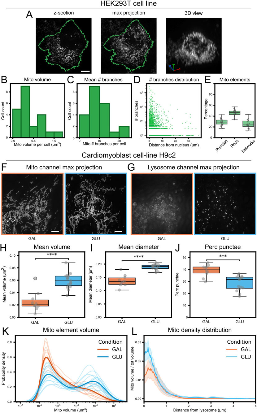 Figure 9. Cell culture datasets analysis. (A) Representative HEK293T cell: left, z-slice; middle, max projection; right, 3D rendering of the mitochondrial channel. In green the cellular outline from the max projection. (B) Histogram of the mean mitochondrial element volume per cell. (C) Histogram of the mean number of branches of mitochondrial elements per cell. (D) Branch number of individual mitochondrial elements as a function of their distance to the nucleus. (E) Population fractions of mitochondria morphological classes: punctae (spherical, unbranched), rods (linear, unbranched) and networks (branched). (F) Max projection of the mitochondria channel in H9c2 Cardiomyoblasts cultured in galactose-based medium (GAL; n = 10 images, orange) versus glucose containing medium (GLU; n = 15 images, light blue). (G) Max projection of lysosome channel. (H–J) Between-condition comparisons: (H) mean mitochondrial element volume per image, (I) mean mitochondrial diameter per image; (J) percentage of punctae per cell. (K) Kernel density estimation (KDE) plot of individual mitochondrial element volumes; thin lines, individual pictures; thick lines, average; colors represent condition (orange for GAL, light blue for GLU). (L) Mitochondrial density plot as a function of the distance from lysosomes; thick lines represent mean distribution; colors represent condition (orange for GAL, light blue for GLU). T-test. ***: p-value <0.001, ****: p-value <0.0001. Scale bar, 5 μm.
