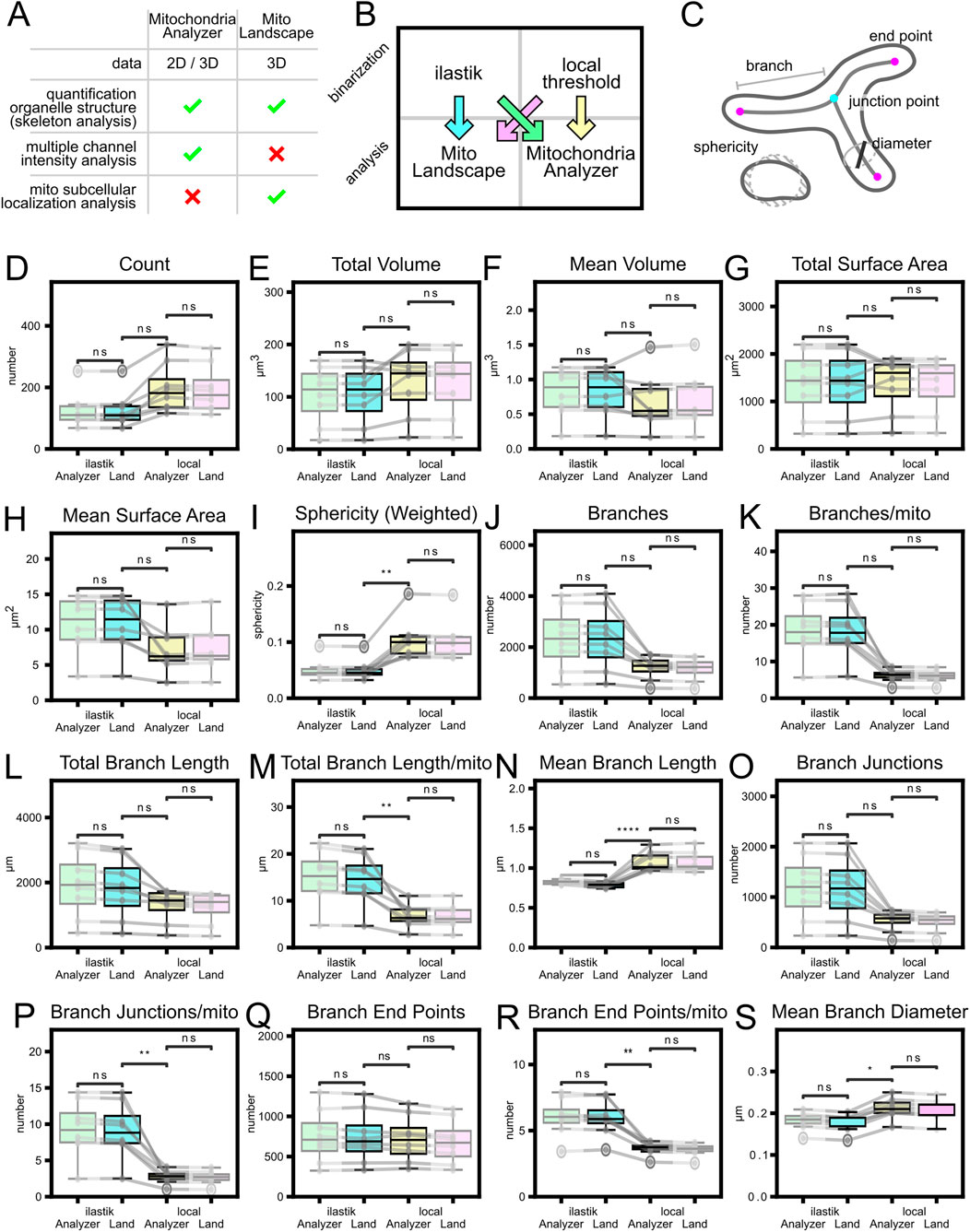 Figure 10. Comparison of analysis pipelines and the dominant effect of binarization. (A) Main features comparison between MitoLandscape and ImageJ plugin Mitochondria Analyzer. (B) HEK cells comparison (8 pictures) was performed following four combinations of parameters: blue, MitoLandscape on ilastik masks; yellow, Mitochondria Analyzer on its own masks; green, Mitochondria Analyzer on ilastik masks; pink, MitoLandscape on Mitochondria Analyzer masks. (C) Mitochondrial morphological features measured by the two pipelines. (D–S) Comparison of metrics distribution across the four different combinations. Gray lines connect same pictures. T-test with Bonferroni correction. *: p-value <0.05, **: p-values <0.01, ***: p-value <0.001, ****: p-value <0.0001.