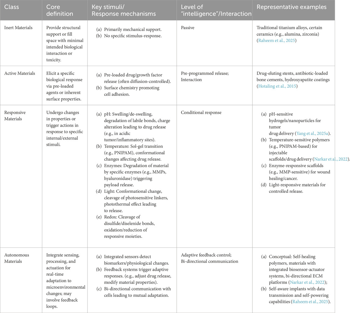 The classification of biomaterials often reflects an increasing level of sophistication in their interaction with biological systems, essentially mirroring an evolution in their biomimetic capabilities (Figure 1). Where inert materials are largely non-biomimetic in their function, merely occupying space, active materials begin to emulate simple biological actions. Responsive materials mimic conditional biological processes, and autonomous materials aim to replicate complex biological control systems, such as homeostatic feedback loops. This progression highlights a journey from static implants to dynamic, self-adaptive platforms (Montoya et al., 2021).