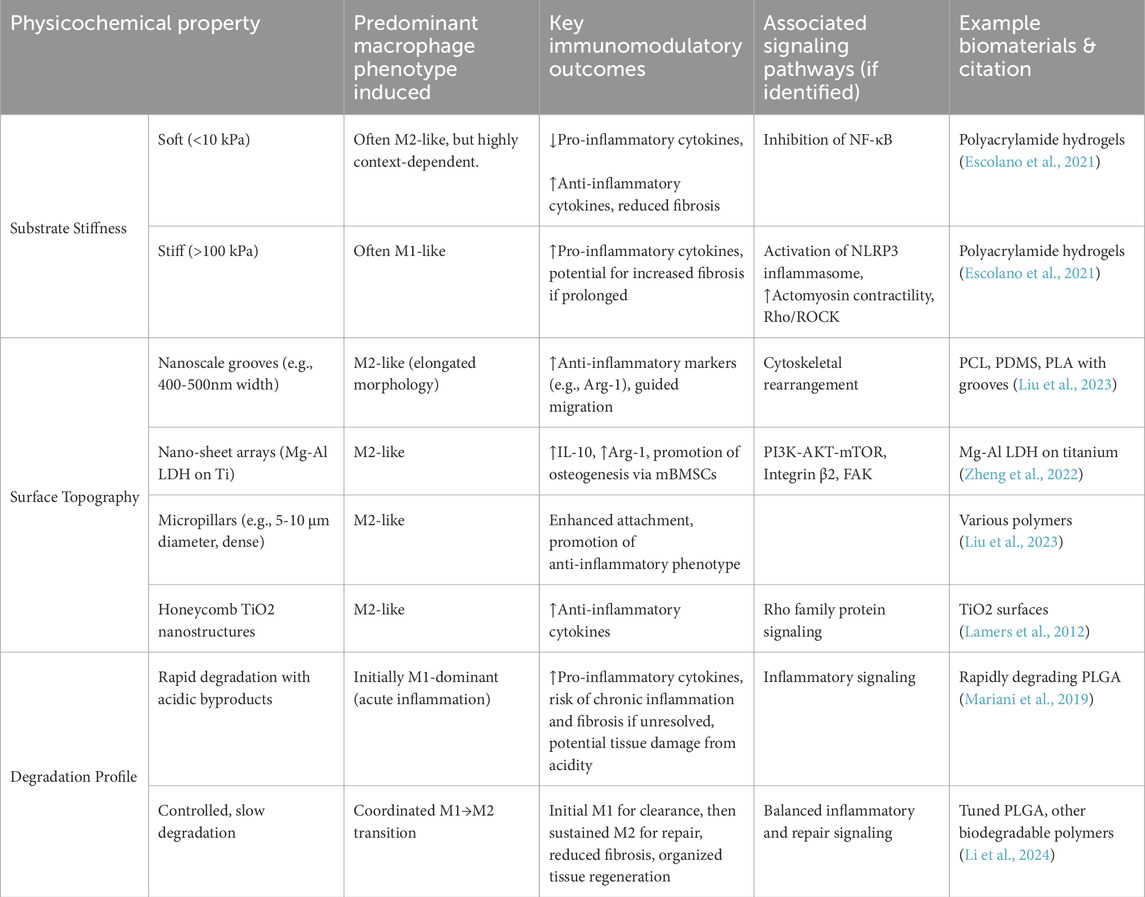 These intricate relationships between material stiffness, topography, and degradation kinetics provide a robust theoretical basis for the rational design of “immune-friendly” or, more accurately, “immuno-instructive” biomaterials. The objective is not necessarily to create materials that are completely “stealthy” and evade all immune detection, but rather to engage the immune system in a controlled, predictable, and ultimately beneficial manner, steering it towards a pro-regenerative trajectory. Table 2 summarizes the impact of key biomaterial physicochemical properties on macrophage polarization and function, drawing from the discussed mechanisms and examples.