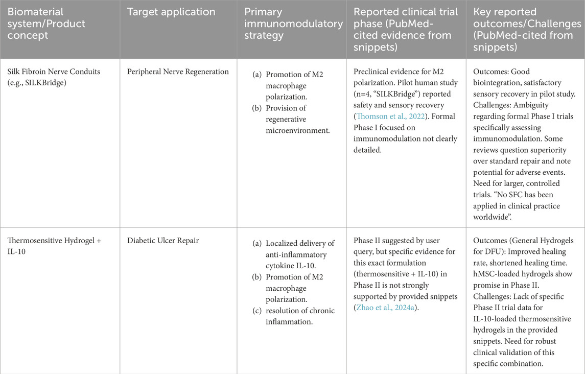 Successfully overcoming these multifaceted translational hurdles mandates intensive and sustained collaboration among experts from diverse fields, including materials scientists, immunologists, bioengineers, pharmacologists, clinicians, and regulatory affairs specialists. A synergistic approach is essential to bridge the gap between fundamental discovery and clinical application. Furthermore, innovation in regulatory science itself is critical. This includes the development of new assessment frameworks, adaptive trial designs, and guidelines that are specifically tailored to the unique characteristics and complexities of smart, responsive, and immunomodulatory biomaterials. A more adaptive and collaborative regulatory environment will be key to fostering the safe and timely clinical adoption of these transformative technologies (Nash et al., 2021). The complexity of these materials may ultimately demand entirely new paradigms for quality control, risk assessment, and post-market surveillance. Table 3 provides an illustrative overview of some clinically investigated smart immunomodulatory biomaterial concepts, based on the user query and the information available within the provided research snippets.