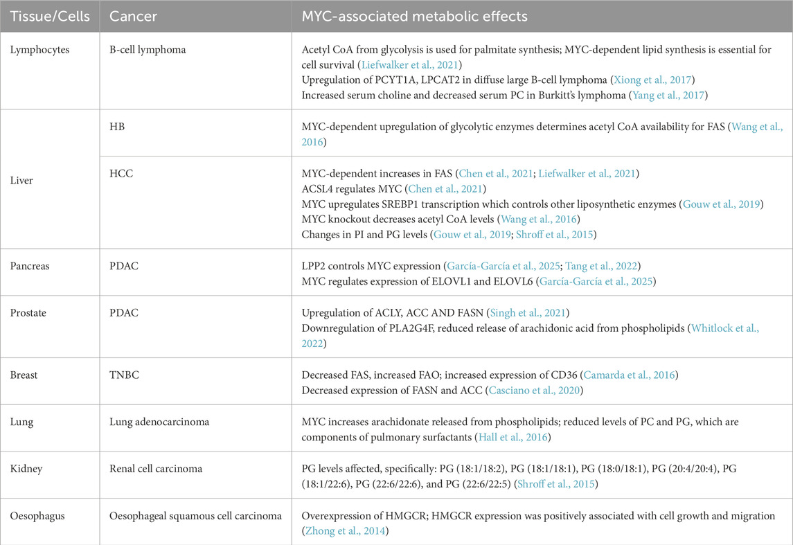 There are significant challenges to targeting MYC activity directly, leading to efforts directed toward inhibiting MYC activity or expression through ancillary methods (McKeown and Bradner, 2014; Whitfield and Soucek, 2025). One of the major downstream effects of MYC overexpression is the metabolic reprogramming of cancer cells. It has been well established that MYC drives increased glycolysis and glutaminolysis along with increased TCA cycling (Goetzman and Prochownik, 2018), and a growing number of studies now discuss the effects of MYC on lipid composition and lipid metabolism in tumor cells. Lipid reprogramming has been shown to affect tumor growth and metastasis, and the cells’ response to therapies. A large proportion of MYC-driven cancer cells show reduced fatty acid oxidation (FAO), and increased fatty acid synthesis (FAS) to provide fatty acids for protein modifications and maintain membrane structure for the consistently proliferating cancer cells (Gouw et al., 2019; Liefwalker et al., 2021; Singh et al., 2021).