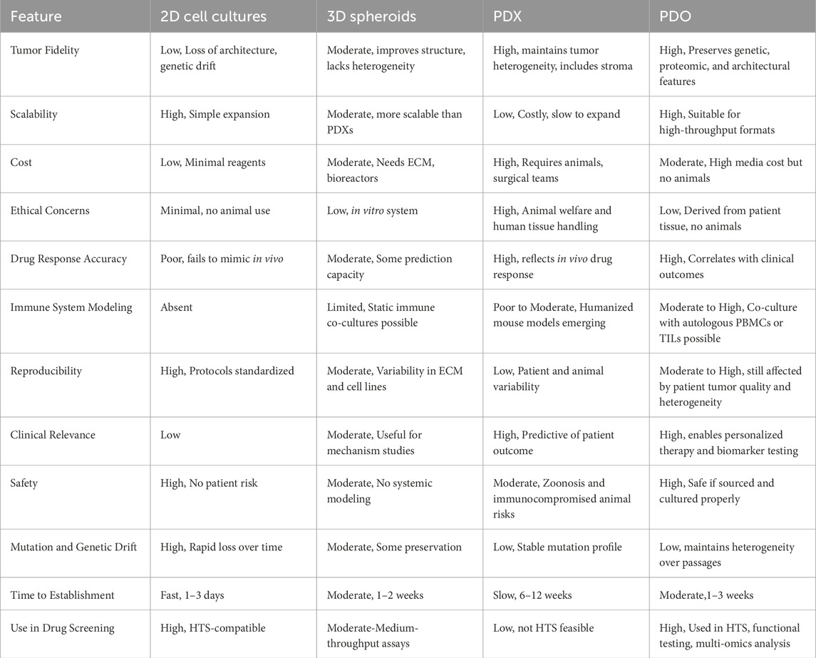 Moreover, creating PDOs from adult stem cells (ASCs) within PDX tissue has emerged as an innovative strategy for generating matched in vitro/in vivo models. These models retain the genomic, histological, and pharmacological profiles of the original tumor, allowing researchers to conduct higher-throughput in vitro screens and validate findings in vivo using the corresponding PDX model. Compared to PDXs, which require the implantation of tumors into immunodeficient mice, PDOs provide faster generation times, reduced ethical concerns, and scalability for high-throughput applications. Thus, each model used to study cancer therapies offers distinct advantages and comes with certain limitations. Table 1 summarizes the key properties and differences among 2D cell cultures, 3D spheroid models, PDXs, PDOs, and other models commonly employed in cancer research. It highlights their relative strengths and limitations in replicating tumor heterogeneity, mimicking the TME, scalability, and suitability for drug screening and personalized medicine. Despite the advantages, the establishment of PDOs remains highly dependent on tumor sample quality. Low-cellularity biopsies, necrotic tissue, or samples with excessive stromal content frequently compromise PDO viability, limiting their expansion and downstream applications in drug screening and personalized medicine. Nevertheless, considerable inter-patient variability in PDO growth efficiency and phenotype remains a major barrier, often complicating therapeutic predictions and limiting cross-study comparability. Furthermore, differences in ECM scaffolds, growth factor supplementation, and media formulations between laboratories highlight the lack of standardized culture conditions, reducing reproducibility and clinical consistency.