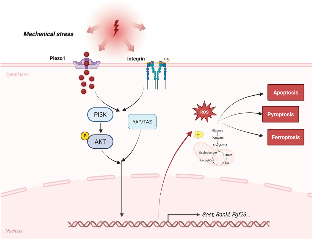 Figure 1. Pathway of bone cells sensing mechanical stress. This figure outlines the signaling pathways by which osteocytes sense mechanical stress. Mechanotransduction pathways, such as those involving Piezo1, integrins, YAP/TAZ, and Wnt/β-catenin, as well as paracrine and endocrine signals, such as sclerostin, RANKL, and FGF23, are depicted. The figure also labels important regulated forms of cell death, including apoptosis, ferroptosis, and pyroptosis, as well as metabolic changes, such as a shift toward glycolysis and increased production of reactive oxygen species, that contribute to osteocyte dysfunction during osteoporosis. Arrows indicate the main signaling pathways and feedback mechanisms in these processes.