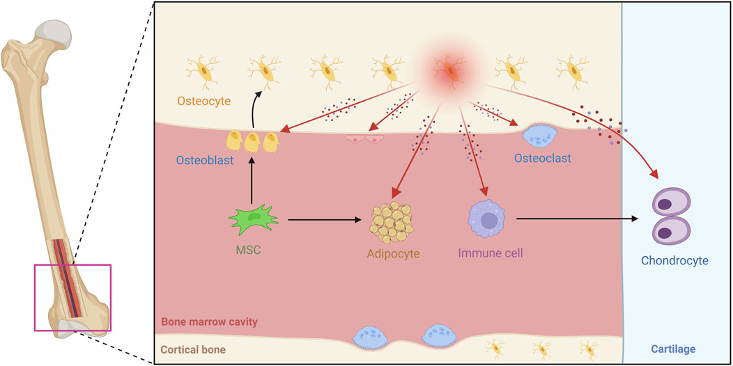 Osteocytes extend beyond the matrix, engaging in “crosstalk” with immune, and stromal elements in the marrow niche (Elango et al., 2018; Cao H. et al., 2020). Perivascular osteoblasts secrete angiogenic factors, such as VEGF, which affect endothelial cells to maintain nutrient supply or cancer metastasis (Chen et al., 2017; Mulcrone et al., 2020). Through MYD88-dependent signaling in response to PAMPs, these cells are able to attract macrophages and T cells, which can intensify inflammation during infection or in arthritis (Yoshimoto et al., 2022). Their engagement with the surrounding matrix includes perilacunar remodeling; in this process, osteocytes use enzymes like MMP13 to break down the local extracellular matrix, allowing them to adjust to metabolic changes (Mazur et al., 2019). Mitochondrial transfer from osteolineage cells to myeloid populations further regulates immune-mediated bone turnover (Ding et al., 2024). Transfer of osteocyte mitochondria to transcortical vascular endothelial cells accelerates angiogenesis and promotes the repair of cortical bone defects (Liao et al., 2024). Mechanically strained osteocyte-derived exosomes containing miR-3110-5p and miR-3058-3p were transported to osteoblasts, accompanied by increased PGE2, IGF-1 and NOS activities, thereby promoting the osteoblastic differentiation (Zhu Y. et al., 2024). Exosomes secreted by osteocytes under mechanical stress disrupt chondrocyte mitochondrial autophagy through miR-23b-3p, promote cartilage breakdown and inhibit synthesis, thereby accelerating the progression of osteoarthritis (Liu et al., 2025). Downregulation of miR-494-3p in extracellular vesicles derived from senescent osteocytes inhibits osteogenic differentiation and accelerates age-related bone loss via the PTEN/PI3K/AKT pathway (Yao et al., 2024). These interactions highlight the role of osteocytes in microenvironmental homeostasis (Figure 2) and have important implications for therapies targeting microenvironmental dysregulation in osteoporosis or metastasis.