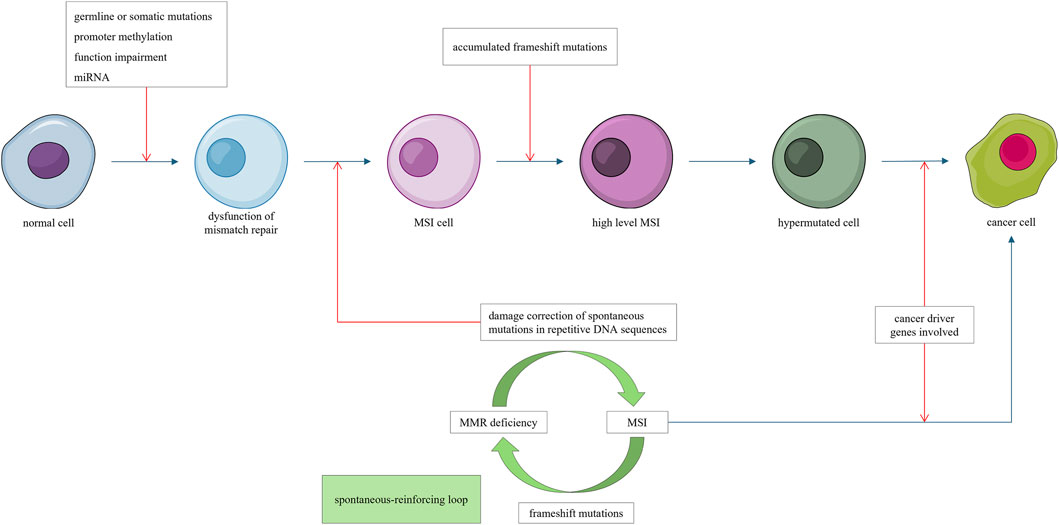 Notably, MSI is a continuous, rather than discrete phenotype (Hause et al., 2016). Deficiency in mismatch repair genes can lead to MSI, whereas frameshift mutations in MSH3 and MSH6 can further aggravate mismatch repair deficiency and increase the level of MSI (Malkhosyan et al., 1996), creating a “mutator mutates other mutators” phenotype. This self-reinforcing “mutator–MSI–mutator” loop can progressively alter gene expression through frameshift mutations until sufficient cancer-related genes are affected, leading to cancer initiation (Figure 1).