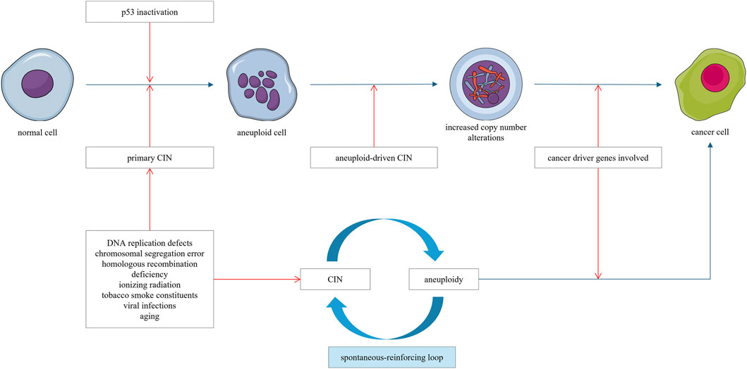 As mentioned above, CIN can cause aneuploidy, which in turn can lead to massive cellular consequences, including further increases in CIN (Chunduri and Storchová, 2019). The degree of CIN depends on the identity and number of aneuploid chromosomes (Zhu et al., 2012). For example, aberrant expression of mitotic transcription regulators induced by aneuploidy can further increase the degree of CIN in breast cancer (Pfister et al., 2018). Aneuploidy exerts complex effects on genomic stability. In certain contexts, it may confer a genome-stabilizing function (Duesberg et al., 1998; Li et al., 2009; Bökenkamp et al., 2025), whereas in other scenarios, aneuploidy itself is sufficient to induce structural instability of chromosomes (Fabarius et al., 2003; Potapova et al., 2013; Lamm et al., 2016). Aneuploidy disrupts the balance of enzyme complexes and alters the dosage of gene products encoded on aneuploid chromosomes. Specifically, dysregulation of genes responsible for DNA synthesis, maintenance, and nucleotide pool homeostasis can trigger subsequent DNA breakage, thereby eliciting chromosomal deletions, amplifications, and rearrangements (Fabarius et al., 2003; Potapova et al., 2013; Lamm et al., 2016). Notably, aneuploidy induces CIN, which in turn amplifies the degree of aneuploidy, creating a spontaneous, self-reinforcing “CIN–aneuploidy–CIN” loop that continuously drives the carcinogenesis process (Figure 2) (Potapova et al., 2013; Fabarius et al., 2003).