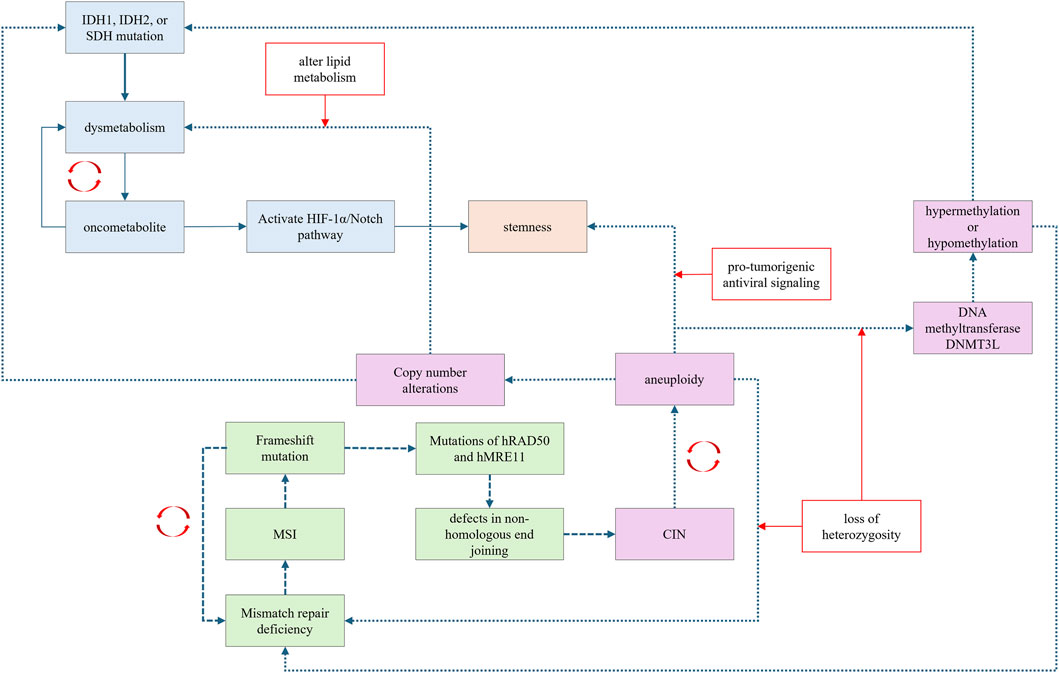 Typically, there are four primary carcinogenic trajectories: mutator phenotype, chromosomal instability (CIN), dysmetabolism, and stemness. The mutator phenotype trajectory posits that deficiencies in DNA repair or synthesis systems exert a mutator effect. Specifically, initially occurring mismatch repair deficiency can impair the function of other normal mismatch repair genes, forming a “mutator-mutates-other-mutators” loop. This loop progressively damages DNA repair systems and drives carcinogenesis by accelerating mutation rates and accumulating oncogenic mutations. The chromosomal instability (CIN) trajectory suggests that CIN induces aneuploidy, which in turn reduces chromosomal stability and exacerbates aneuploidy—forming a “CIN-aneuploidy-CIN” loop. This loop leads to progressive copy number alterations (CNAs) in genes; once CNAs in cancer-related genes reach the threshold for malignant transformation, cancer originates. The dysmetabolic trajectory proposes that the accumulation of oncometabolites (a consequence of alterations in metabolism-related genes) amplifies dysmetabolism, establishing a “dysmetabolism-oncometabolite-dysmetabolism” loop. These oncometabolites then promote oncogenic signaling and induce cancer origin. The stemness trajectory indicates that cells with stemness properties undergo malignant transformation in response to oncogenic stimuli, generating cancer cells that retain stemness characteristics. In the carcinogenesis process, oncogenic drivers can self-maintain and amplify, triggering an oncogenic cascade that accumulates oncogenic signals until cellular transformation occurs. Notably, the longer the carcinogenic loop persists, the more oncogenic signals are activated—and consequently, the higher the probability of malignant transformation. Therefore, targeting these carcinogenic trajectories and disrupting self-reinforcing oncogenic loops may present a potential therapeutic strategy.