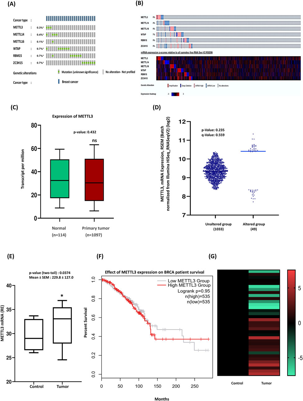 (A) Bar graph showing genetic alterations in specific genes associated with breast cancer, with percentages and types of alterations noted. (B) Genetic alteration and expression heatmap for selected genes, indicating levels of amplification, deletion, mutation, and mRNA expression. (C) Box plot comparing expression of METTL3 in normal versus primary tumor tissues, showing no significant difference. (D) Scatter plot of METTL3 mRNA expression in unaltered and altered groups with non-significant p and q-values. (E) Box plot showing significantly increased METTL3 mRNA in tumor versus control. (F) Kaplan-Meier plot displaying METTL3 expression impact on breast cancer patient survival, with no significant difference between groups. (G) Heatmap illustrating METTL3 expression differences between control and tumor samples.