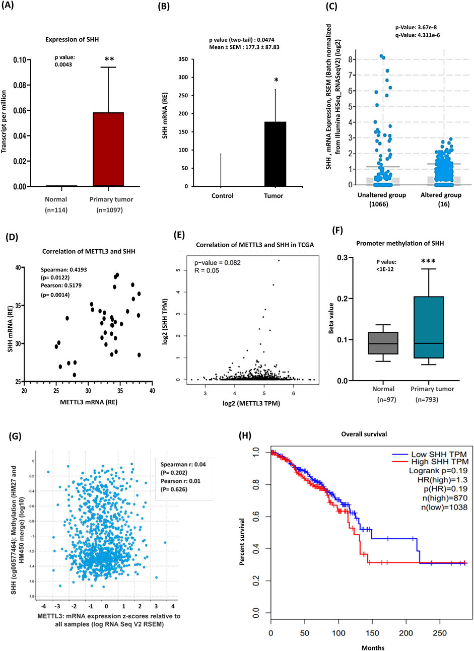Multiple graphs analyzing the expression and correlation of SHH (Sonic Hedgehog) and METTL3 in tumors and normal tissues. (A) Bar graph showing higher SHH expression in primary tumors compared to normal tissue, with significant p-value (0.0043). (B) Bar graph illustrating increased SHH mRNA levels in tumors, with a significant two-tailed p-value (0.0474). (C) Dot plot depicting SHH mRNA expression differences between unaltered and altered groups, with highly significant p and q-values. (D) Scatter plot correlating METTL3 and SHH mRNA levels, showing moderate positive correlations. (E) Scatter plot in TCGA correlating METTL3 and SHH with non-significant p-value. (F) Box plot showing increased SHH promoter methylation in tumors with a highly significant p-value. (G) Scatter plot correlating METTL3 mRNA expression and SHH methylation, showing weak correlations. (H) Kaplan-Meier plot evaluating overall survival based on SHH TPM levels, indicating no significant difference.