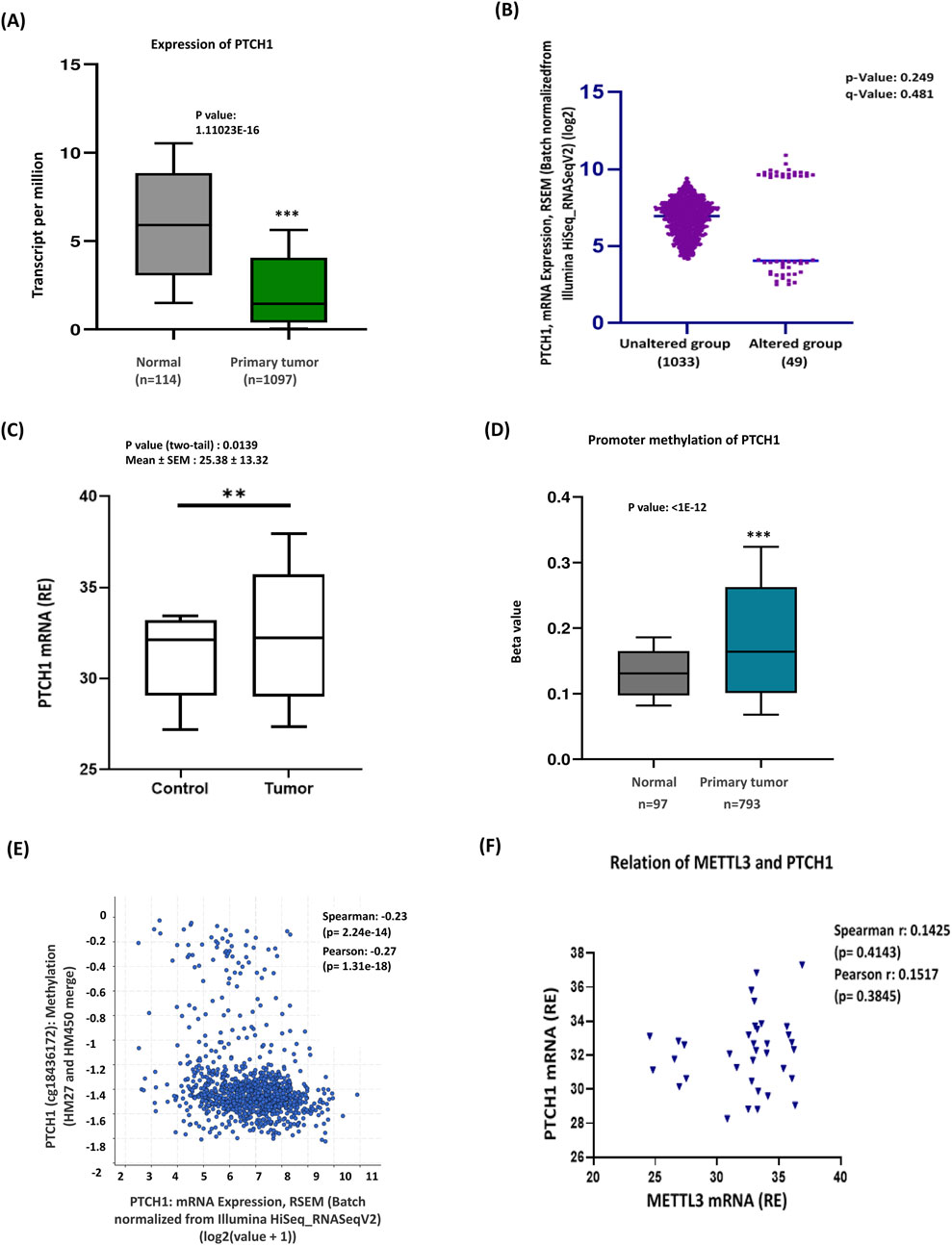 Figure 3. Promoter hypermethylation reduced PTCH1 expression in breast cancer. (A) TCGA database analysis shows a significantly lower expression of PTCH1 in breast cancer tissues. (B) The cBioportal analysis of PTCH1 revealed a 5% alteration in expression, with some regions affected, while the surrounding unaltered areas exhibit a robust expression profile. (C) Experimental data showing increased PTCH1 expression in breast cancer (n = 35) compared to control tissues. (D) Methylation analysis supporting PTCH1 promoter hypermethylation in primary tumors. The gene in question is altered in 49 (5%) of the queried patients or samples. (E) Correlation of PTCH1 methylation and mRNA expression (Spearman: 0.23, Pearson: 0.27). This negative correlation suggests that hypomethylation leads to PTCH1 activation. (F) Correlation between PTCH1 mRNA and METTL3 mRNA. ***p < 0.001 vs. control.
