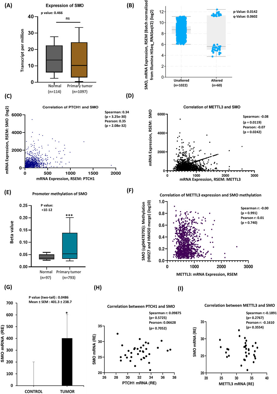Figure 4. SMO mRNA alteration is associated with PTCH1 and METTL3 expressions. (A) TCGA data analysis of breast cancer patients. (B) SMO mRNA expression alteration: the graph compares SMO mRNA expression between the altered and unaltered groups. (C) Co-expression analysis of PTCH1 and SMO. (D) Co-expression of METTL3 and SMO: the scatterplot shows a positive correlation between METTL3 and SMO mRNA. (E) Box plot compares SMO promoter methylation levels between normal tissue (n = 97) and primary tumor tissue (n = 793). (F) The relationship between METTL3 mRNA expression (x-axis) and SMO methylation levels (y-axis). (G) Experimental validation of SMO mRNA overexpression in tumor samples (n = 35) compared to control samples. (H) Correlation analysis between PTCH1 and SMO. (I) Co-expression between METTL3 and SMO expression. *p < 0.05 vs. control.