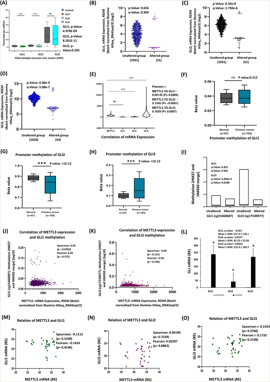 Figure 5. Expression and methylation pattern of GLI transcription factors: (A) Patterns of expression for the GLI family of genes—GLI1, GLI2, and GLI3. (B–D) The analysis of mRNA expression from cBioPortal. (E) Correlation of mRNA expression levels between the METTL3 and GLI family genes. (F–H) The boxplot compares promoter methylation of GLI, GLI2 and GLI3 genes in normal and primary breast cancer tissues. (I) Methylation patterns of GLI1 and GLI3. GLI2 does not show methylation data in the database. (J,K) The data represent the relationship between METTL3 expression and the methylation patterns of the GLI1 and GLI3 genes. (L) GLI1, GLI2, and GLI3 mRNA expression levels are measured in tumor (n = 35) and control samples by qRT-PCR. (M–O) The scatter plot showing the correlation of METTL3 and GLI genes in experimental data. ***p < 0.001 vs. control.
