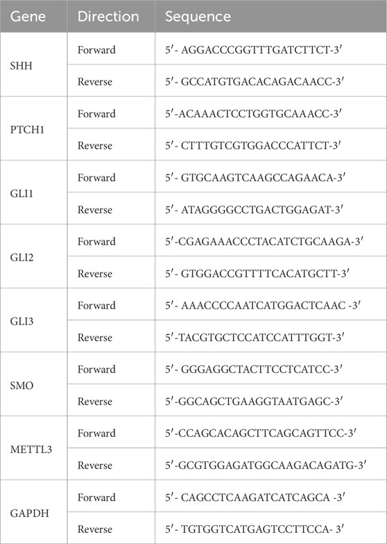 GLI transcription factors (GLI1, GLI2, and GLI3) are the principal effectors of the Sonic Hedgehog (SHH) pathway, crucial for regulating gene expression associated with cell cycle progression and survival. In breast cancer, increased expression of these factors is linked to heightened transcriptional activity of oncogenic targets, contributing to tumor growth and poor clinical outcomes. Zhang et al., demonstrated that SHH-Medulloblastoma (SHH-MB) showed significant RNA m6A hypermethylation compared to normal cerebella, with overexpression of the m6A methyltransferase METTL3 leading to hypermethylation of PTCH1 and GLI2. This hypermethylation promotes sustained hedgehog signaling, further advancing SHH-MB tumor progression (Zhang et al., 2022). Additionally, in prostate cancer, METTL3 depletion resulted in decreased GLI1 expression and significantly reduced mRNA levels of downstream SHH signaling targets, such as c-Myc and Cyclin D1, ultimately inducing cell apoptosis (Cai et al., 2019). Notably, elevated levels of GLI1, GLI2, and GLI3 correlate with worse relapse-free survival in breast cancer patients, particularly in HER2-positive tumors (Zhang et al., 2022; Mastrangelo and Milani, 2018). While previous studies showed no significant changes in the relationship between METTL3 and GLI3, our study identified a noteworthy connection between them, suggesting potential interactions that warrant further exploration. The increase in GLI1, GLI2, and GLI3 levels in our findings indicates that METTL3 may enhance SHH signaling, activating the transcription of downstream target genes and contributing to tumorigenesis.