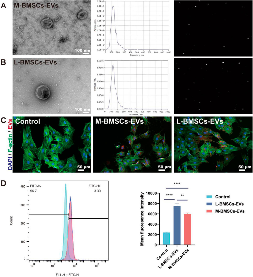 Figure 1. Characterization and internalization of EVs. (A) Morphological characterization and NTA of M-BMSCs-EVs. Scale bar: 100 nm. (B) Morphological characterization and NTA of L-BMSCs-EVs. Scale bar: 100 nm. (C) Internalization of EVs. Scale bar: 50 μm. (D) Quantitative analysis of EVs uptake. *p < 0.05, **p < 0.01, ***p < 0.001, ****P < 0.0001, n = 3.