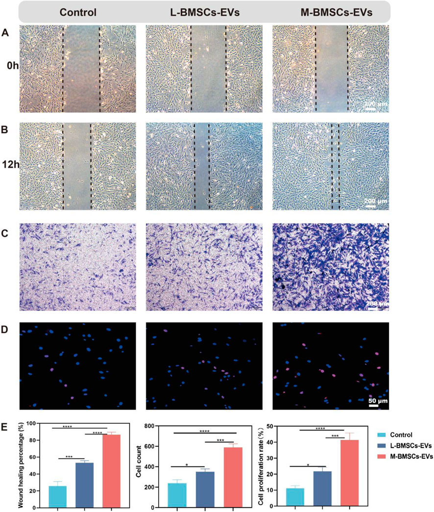 Figure 2. Effects of M-BMSCs-EVs and L-BMSCs-EVs on BMSCs’ physiological functions. (A,B) Representative images of the migration assay at 0 h and 12 h. Scale bar: 200 μm. (C) Representative images of the Transwell assay at 12 h. Scale bar: 200 μm. (D) EdU proliferation assay. Scale bar: 50 μm. (E) Quantitative analysis of the migration assay, Transwell assay, and EdU proliferation assay. PBS is used as the control. Data are presented as mean ± SD, *p < 0.05, **p < 0.01, ***p < 0.001, ****P < 0.0001, n = 3.