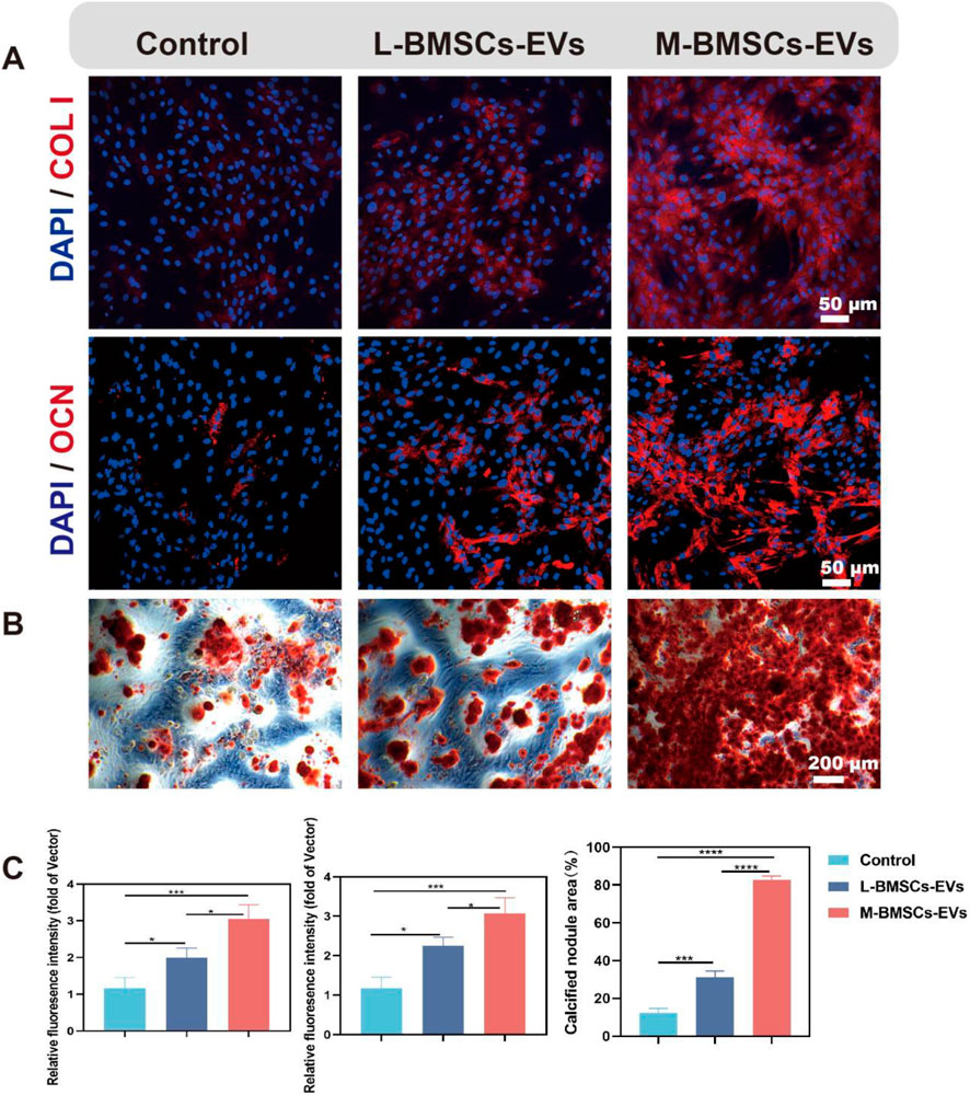 Figure 3. Effects of M-BMSCs-EVs and L-BMSCs-EVs on osteogenic differentiation of BMSCs in vitro. (A) Immunofluorescence images of COL I and OCN. Scale bar: 50 μm. (B) ARS staining of BMSCs after osteogenic induction. Scale bar: 200 μm. (C) Quantitative analysis of COL I and OCN immunofluorescence and ARS staining. PBS is used as the control. Data are presented as mean ± SD, *p < 0.05, **p < 0.01, ***p < 0.001, ****P < 0.0001, n = 3.