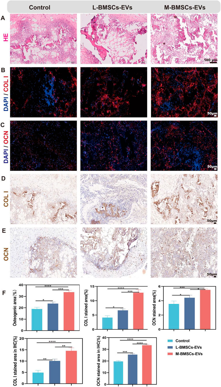 H&E staining revealed the formation of newly generated bone-like tissue in all three groups (Figure 4A), with more bone like tissue in L-BMSCs-EVs and M-BMSCs-EVs, indicating enhanced bone formation induced by EVs. Among the groups, the M-BMSCs-EVs group exhibited the most abundant bone-like tissue (Figure 4F). Immunofluorescence and immunohistochemical staining are then performed to analyze the staining of bone-specific proteins COL I and OCN in the newly formed tissue. Immunofluorescence staining showed increased expression of COL I and OCN proteins in both L-BMSCs-EVs and M-BMSCs-EVs groups compared with the control group, with the M-BMSCs-EVs group showing the highest expression (Figures 4B,C,F). Immunohistochemical staining demonstrated strong positive staining for COL I and OCN proteins in the L-BMSCs-EVs and M-BMSCs-EVs groups, whereas relatively weak staining is observed in the control group, indicating a visible contribution of EVs derived from BMSCs to the process of bone regeneration. Additionally, the M-BMSCs-EVs group exhibited significantly higher expression of COL I and OCN proteins, indicating that M-BMSCs-EVs demonstrated a more efficient promotion of bone regeneration among all the groups (Figures 4D–F).