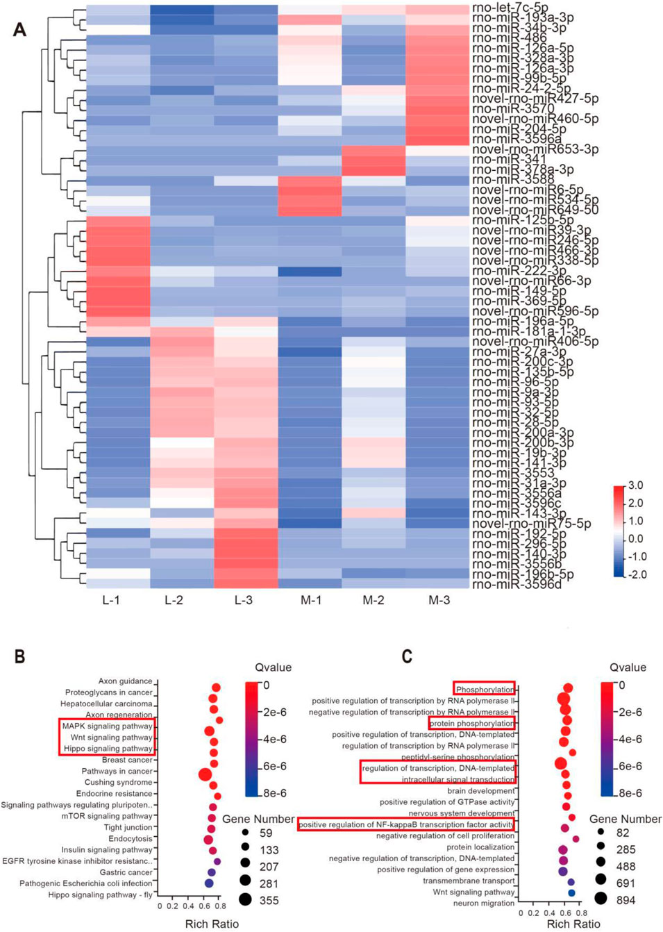 Figure 5. Transcriptional profiling of EVs reveals potential mechanisms underlying the differential impact of EVs. (A) Heatmap displaying the distinct miRNA profiles of M-BMSCs-EVs and L-BMSCs-EVs. (B) KEGG enrichment analysis of the upregulated miRNAs’ predicted target genes. (C) GO enrichment analysis of the upregulated miRNAs’ predicted target genes.