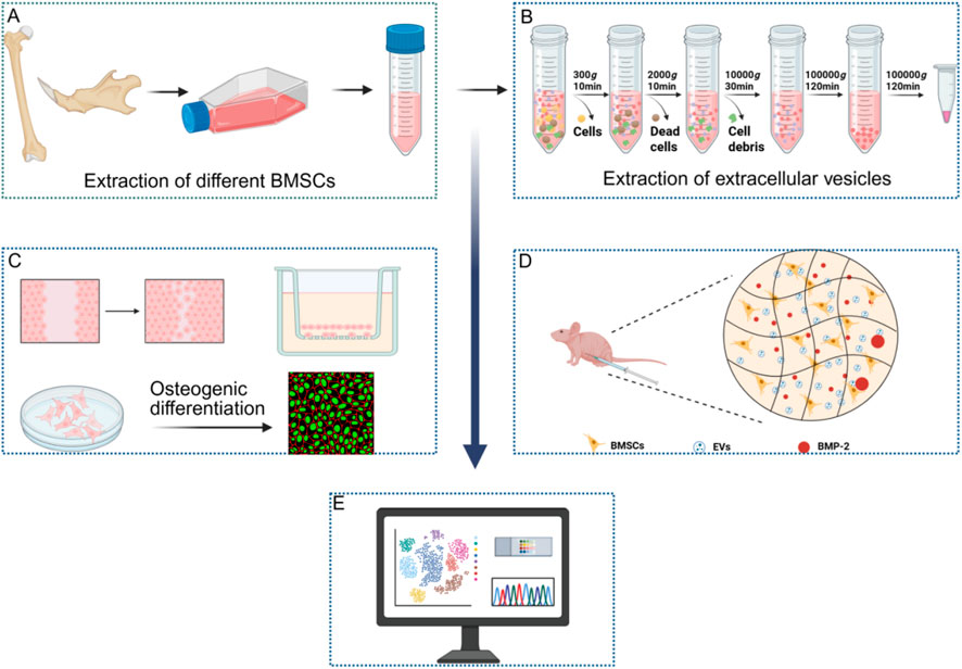 GRAPHICAL ABSTRACT | (A) Extraction of BMSCs. (B) Extraction of EVs. (C) Effects of EVs on proliferation, migration and osteogenic differentiation. (D) Effects of EVs on bone formation in vivo. (E) Transcriptomic analysis. (Created on Biorender).