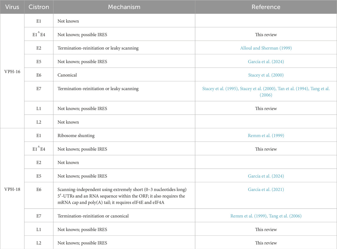 L1 and L2 are transcribed from the late region of the HR-HPVs genome (Figure 2C) (Doorbar et al., 2015; Graham, 2017; Nelson and Mirabello, 2023; Rosendo-Chalma et al., 2024). So far, no mechanism of mRNA translation has been elucidated for the L1 and L2 mRNAs, but we propose here that they might be translated by IRESs. Further experimental analyses also should be performed to prove it. In Table 1 we summarize the mechanisms used to translate the different HPV-16 and HPV-18 cistrons.