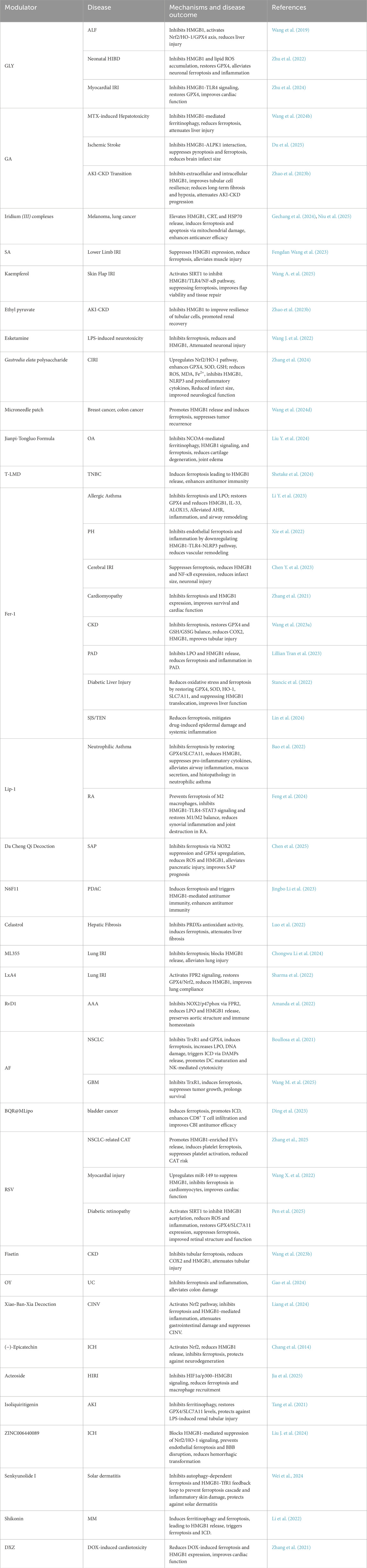 The ferroptosis–HMGB1 axis plays a critical role in DILI, notably under antibiotic and chemotherapeutic exposure. Ceftiofur, a common veterinary antibiotic, enhanced hepatic ferroptosis evidenced by upregulation of key markers, including TfR1, ACSL4, cyclooxygenase-2 (COX2), HMGB1, and thioredoxin-interacting protein (TXNIP), along with downregulation of protective factors such as GPX4, SLC7A11, and ferritin (Hou L. et al., 2024). Similarly, chemotherapeutics such as methotrexate (MTX) trigger HMGB1-mediated autophagic ferroptosis via NCOA4-dependent ferritinophagy, leading to iron overload and lipid peroxidation. The inhibition of HMGB1 by glycyrrhizic acid (GA) effectively mitigates MTX-induced liver injury, highlighting its therapeutic potential (Wang et al., 2024b). Furthermore, in ALF, oxidative stress and ferroptosis are key drivers of hepatocyte damage. Glycyrrhizin (GLY), a verified selective inhibitor of HMGB1, attenuates ALF by reducing HMGB1 expression, restoring GPX4 and GSH, and activating Nrf2/HO-1 signaling, thereby breaking the feedback loop between HMGB1 release and oxidative damage, underscoring its therapeutic value in ALF (Wang et al., 2019).