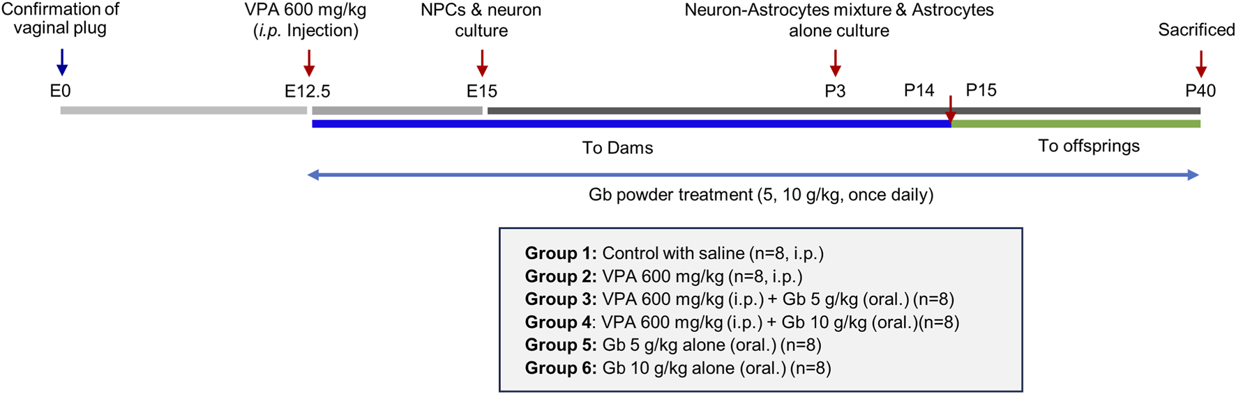 Eight-week-old male and female ICR mice (20–25 g) were obtained from Samtaco (Suwon, South Korea). The animals had ad libitum access to water and a standard rodent chow diet. They were housed under controlled conditions at a temperature of 24 ± 2 °C, humidity of 50% ± 10%, and a 12-h light/dark cycle. All efforts were made to minimize the number of animals used and to reduce stress and suffering. The mice underwent a 1-week acclimation period before the experiment commenced. Subsequently, male and female mice were paired for mating, with the presence of a vaginal plug marking embryonic day 0 (E0). Pregnant mice were maintained for 12 days before being assigned to one of the six experimental groups: (1) control group (n = 8), (2) VPA 600 mg/kg (n = 8), (3) VPA 600 mg/kg + 5 g/kg Gb extract (n = 8), (4) VPA 600 mg/kg + 10 g/kg Gb extract (n = 8), (5) 5 g/kg Gb extract (n = 8), and (6) 10 g/kg Gb extract (n = 8). On E12.5, pregnant females received an Intraperitoneal injection of either 600 mg/kg VPA or normal saline (0.9%). Following administration, only the pregnant mice not designated for embryo collection were returned to their cages and left undisturbed until natural parturition, which typically occurred between E21 and E23, as illustrated in Figure 1, whereas those assigned for embryo collection were humanely euthanized at the designated embryonic stages. The offspring in each group were nursed by their dams for 2 weeks until P14. After weaning, when they were able to intake a solid food freely, the Gb extract was orally administered to the offspring using the same procedure as that applied to the dams. Subsequently, the dams were sacrificed. Gb extracts were administered with or without concurrent VPA treatment from E12.5 until P40, as illustrated in Figure 1. All procedures involving animals were reviewed and approved by the Animal Experimentation Ethics Committee of Jeonbuk National University [JBNU 2024-071].