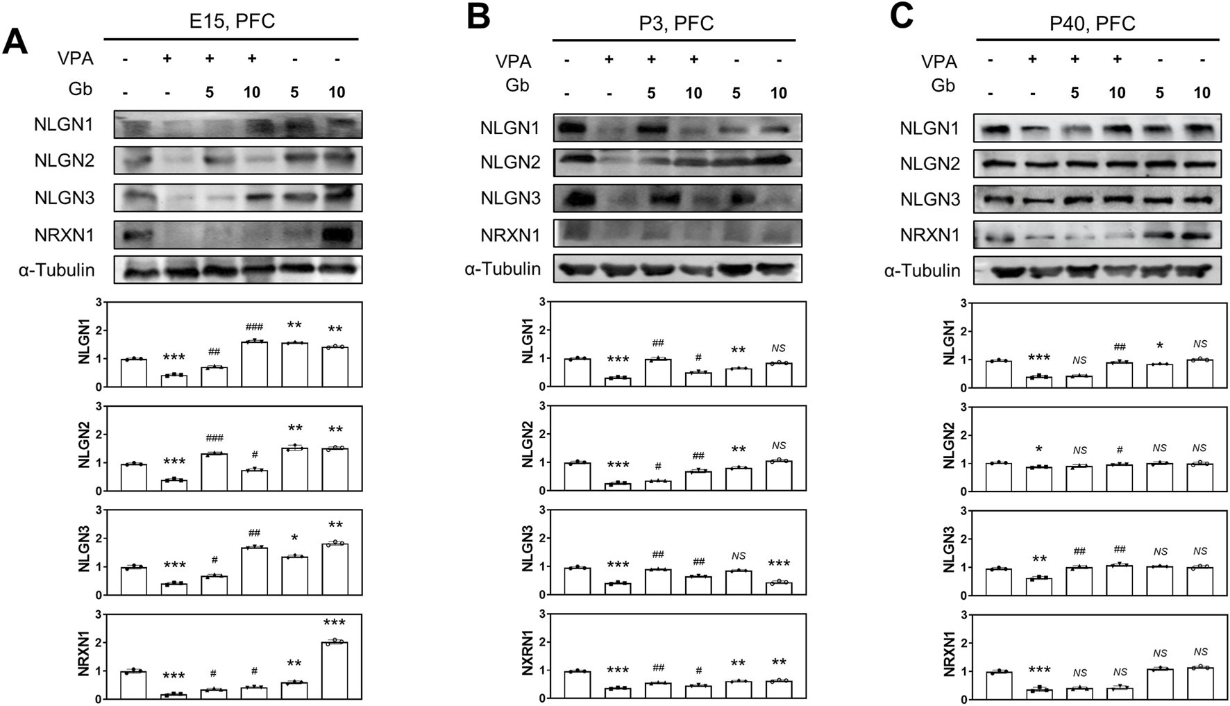 NLGNs and NRXNs play a crucial role in the differentiation, maturation, and stabilization of both inhibitory and excitatory synapses. The findings revealed a significant reduction in the expression of NLGN family proteins (NLGN1, NLGN2, and NLGN3) and NRXN1 in the VPA-treated groups at E14, P3, and P40 (E14 and P3, p ≤ 0.001; P40, p ≤ 0.001, p ≤ 0.05, p ≤ 0.01 and p ≤ 0.001, respectively, Figures 4A–C). No significant changes were observed in NLGNs and NRXN1 expression in the Gb extract-only group compared with the control group. However, Gb extract treatments with VPA 600 mg/kg successfully restored the expression of NLGNs and NRXN1 at E14 (p ≤ 0.001, p ≤ 0.001, p ≤ 0.01 and p ≤ 0.05, respectively), P3 (p ≤ 0.01, p ≤ 0.01, p ≤ 0.01 and p ≤ 0.01, respectively), and P40 (p ≤ 0.01, p ≤ 0.05, p ≤ 0.01, NS, respectively) (Figures 4A–C).
