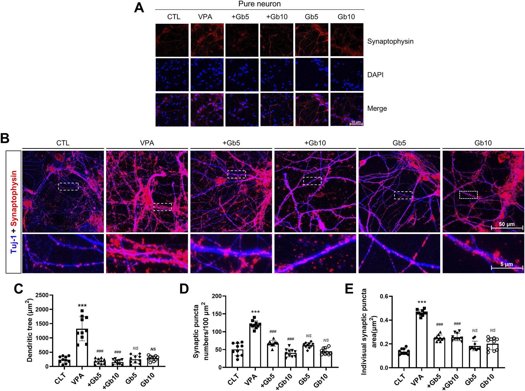 Synaptogenesis, a vital process throughout life, is particularly accelerated during early brain development. To explore synapse formation, autism was induced in mice through VPA treatment, and cortical neurons derived from E15 fetuses were analyzed. Immunofluorescence staining of cortical neurons using synaptophysin, a well-established marker for presynaptic vesicle membranes, revealed significantly elevated synaptophysin expression in the VPA group compared with both the control and Gb extract-treated groups (5 g/kg and 10 g/kg) (Figure 5A). Gb extract 5 g/kg group and 10 g/kg group nearly normalized VPA-induced synaptophysin abnormalities, demonstrating a protective effect at both doses (Figure 5A).