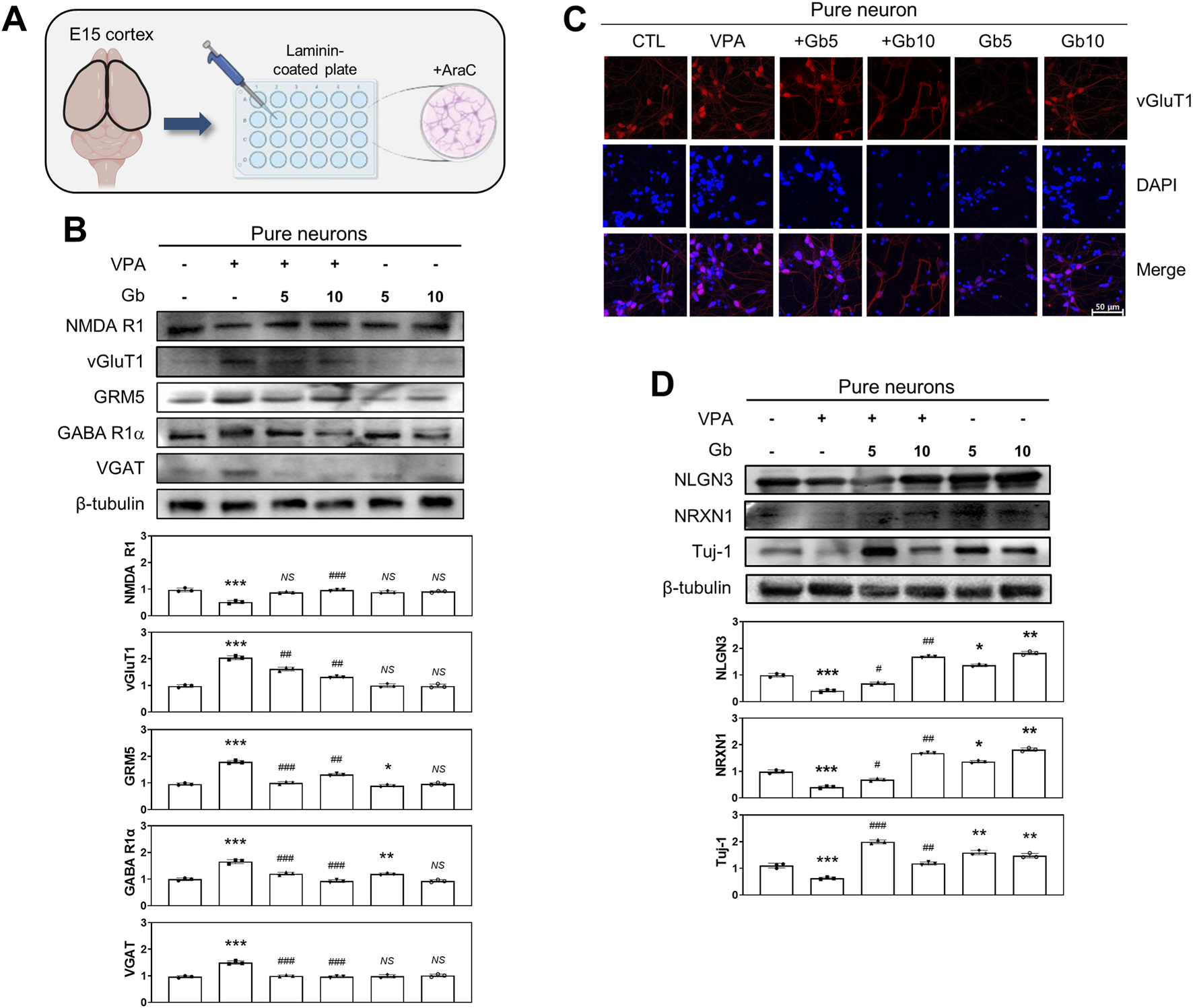 To elucidate the key role of specific cell types in regulating E/I balance within a VPA-induced ASD mouse model, cortical neurons and astrocytes were cultured either separately or together, and various E/I neuronal activities were assessed. Primary cortical neurons isolated from E15 mouse brains (Figure 7A) were stained for vGluT1, a vesicular glutamate transporter and a specific marker of glutamatergic neurons. In the VPA-treated group, vGluT1 expression was highly elevated (p ≤ 0.001); however, co-administration of 5 or 10 g/kg Gb extract restored vGluT1 levels to those observed in the control group (p ≤ 0.01) (Figure 7C). Further analysis of glutamatergic and GABAergic transporters, both pre- and postsynaptic, as well as vesicular transporters, was performed using western blotting (Figures 7B,D). In the VPA group, NMDA R1 expression, a receptor that amplifies excitatory synaptic activity, was reduced to approximately half of the control level (p ≤ 0.001). However, this expression was restored to control levels in both the 5 and 10 g/kg Gb extract-treated groups (5 g/kg, NS; 10 g/kg, p ≤ 0.001) (Figure 7B). GABA, the primary inhibitory neurotransmitter, and its excitatory counterpart, glutamate, were also analyzed. In the VPA group, GABA R1α expression was nearly doubled compared with the control group (p ≤ 0.001); however, treatment with 5 and 10 g/kg Gb extract restored its expression to control levels in a dose-dependent manner (p ≤ 0.001) (Figure 7B). Similarly, VGAT expression, which is associated with inhibitory neurotransmission, was significantly increased in the VPA group (p ≤ 0.001), but normalized in both the Gb extract-treated groups (p ≤ 0.001) (Figure 7B). In contrast, vGluT1 expression, which was significantly elevated in the VPA group (p ≤ 0.001), was restored to control levels following Gb extract treatment (p ≤ 0.01) (Figure 7B). Furthermore, GRM5 expression was nearly doubled in the VPA group compared to that in the control group (p ≤ 0.001) but was notably reduced in the Gb extract-treated groups, particularly at the 5 g/kg dose (5 g/kg, p ≤ 0.01; 10 g/kg, p ≤ 0.01) (Figure 7C). Expression of Tuj-1, a neuron-specific marker, was significantly reduced in the VPA group (p ≤ 0.001); however, it showed a substantial increase in the 5 g/kg Gb extract-treated group, surpassing control levels (p ≤ 0.001). In contrast, Tuj-1 expression in the 10 g/kg group was similar to that of the control (p ≤ 0.01) (Figure 7D). Both NLGN3 and NRXN1, presynaptic and postsynaptic proteins, respectively, were significantly reduced in the VPA group (p ≤ 0.001), and treatment with Gb extract almost completely restored these VPA-induced effects (5 g/kg, p ≤ 0.05 and p ≤ 0.01 respectively; 10 g/kg, p ≤ 0.05 and p ≤ 0.01, respectively) (Figure 7D).