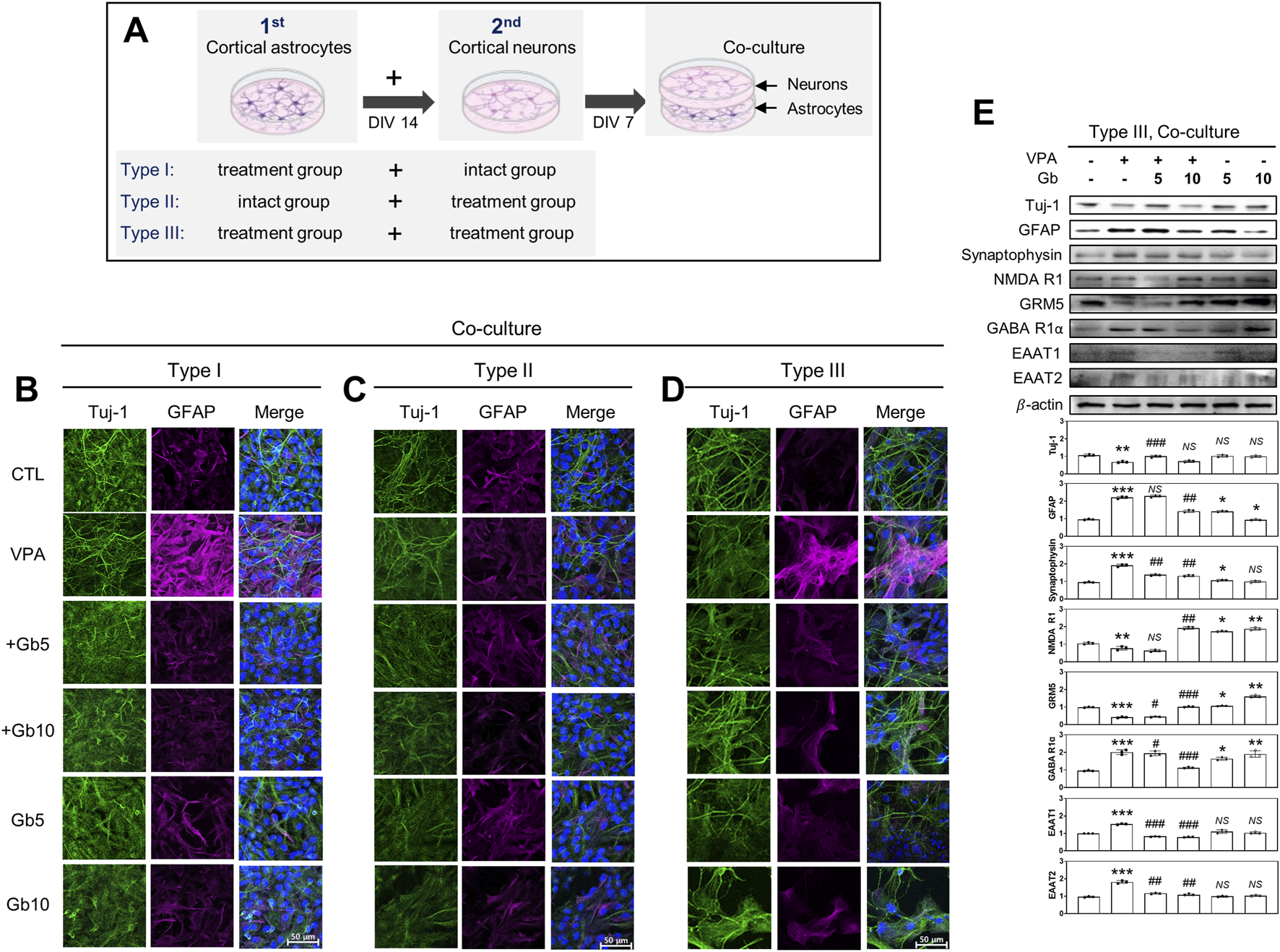 Crucial role of astrocytes in excitatory and inhibitory (E/I) neurotransporter activities in Gryllus bimaculatus (Gb) extract-treated mixed cultures from valproic acid (VPA)-treated mouse brain. (A) Schematic representation of three different types of mixed culture systems derived from embryonic and postnatal mouse brains: Type 1, astrocytes from each treatment group combined with neurons from untreated mice; Type 2, astrocytes from untreated mice combined with neurons from each treatment group; Type 3, astrocytes and neurons both derived from the same treatment group. Astrocytes from postnatal day 3 mouse brains were seeded for 7 days, followed by the addition of cortical neurons from embryonic day 15 mouse brains onto astrocytes monolayers for an additional 7 days. (B–D) Confocal microscopy images of the different types of mixed cultures. Cells were fixed and immunostained for Tuj-1 (green) and GFAP (purple), with nuclei counterstained using DAPI (blue). Scale bar: 50 μm. Experimental groups included CTL (saline, n = 8); VPA (600 mg/kg VPA, n = 8); VPA + Gb5 (600 mg/kg VPA + 5 g/kg Gb extract, n = 8); VPA + Gb10 (600 mg/kg VPA + 10 g/kg Gb extract, n = 8); Gb5 (5 g/kg Gb extract, n = 8); Gb10 (10 g/kg Gb extract, n = 8). (E) Western blots analysis of type III mixed culture. Cell lysates were immunoblotted for Tuj-1, GFAP, synaptophysin, NMDA receptor 1 (NMDA R1), GABA receptor 1α (GABA R1α), EAAT1, and EAAT2. Equal amounts of protein were loaded per each lane, with β-actin serving as the loading control. Bars represent fold-changes in the densitometric values of the bands relative to the corresponding β-actin densities. Control values were normalized to 1 (mean ± SEM, n = 3; *p < 0.05, **p < 0.01, ***p < 0.001 compared with control; #p < 0.05, ##p < 0.01, ###p < 0.001 compared with VPA alone; ns, not significant).