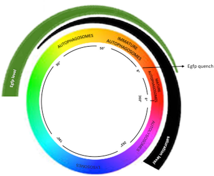 Figure 1. Hue Method—This method categorizes colors by angles, as described in https://www.mrexcel.com/forum/excel-questions/559852-rgb-hue-formula.html. Vesicles between 50° and 80° are yellow; autophagosomes between 9° and 50° are orange; immature autolysosomes (0°–8° and 356°–360°) are red; fused autolysosomes (263°–357°) are purple; lysosomes (190°–262°) are blue.
