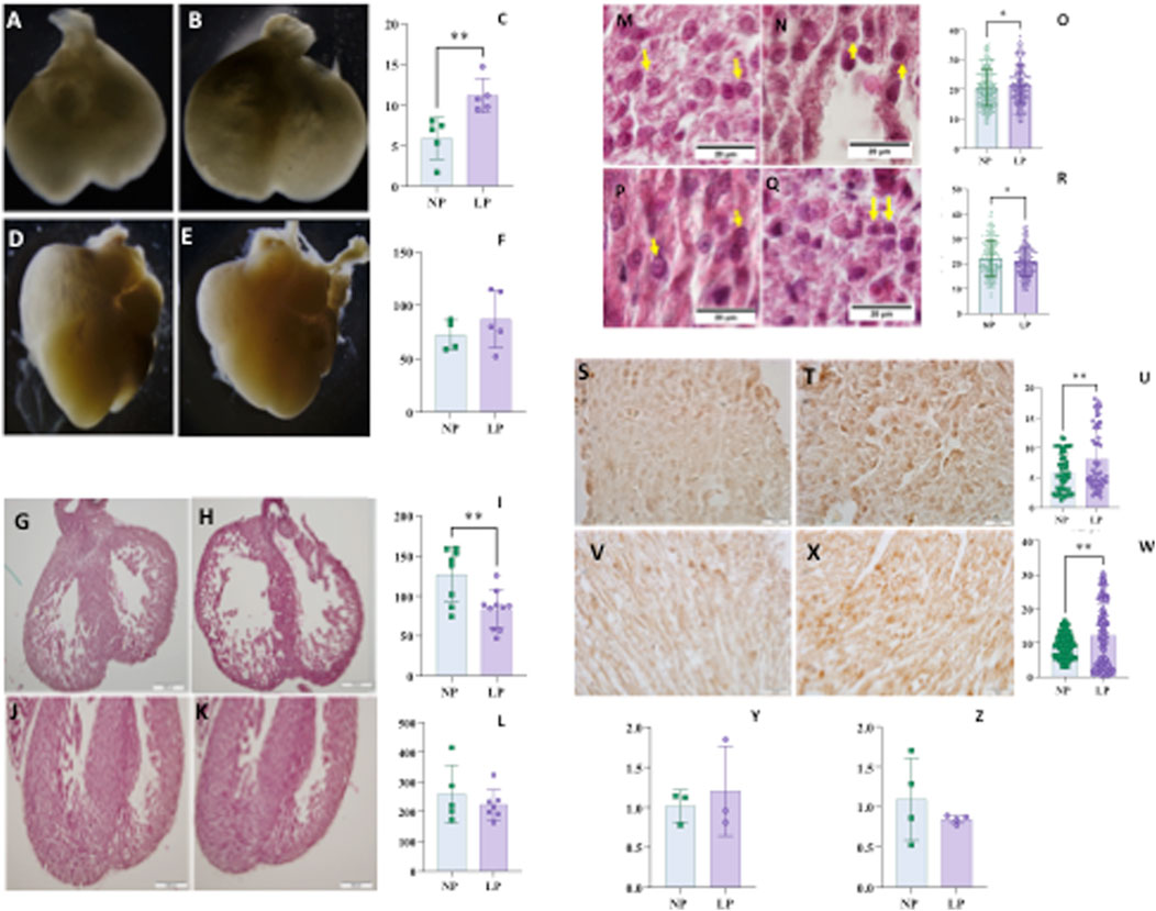 Figure 2. Heart volume normalized by body mass of fetuses at 14 days of gestation (panel C), NP: 28,26 ± 12,26 n = 5 vs. LP: 54,14 ± 8,102 n = 5, p = 0,0043, and NP illustrated picture (Panel A) and LP illustrated picture (Panel B). At 18 days of gestation (panel F), NP: 73,83 ± 21,15 n = 4 vs. LP: 84,29 ± 28,04 n = 4, p = 0,5728, and NP illustrated picture (panel D) and LP illustrated picture (panel E). Ventricle wall thickness at 14 GD (panel I), NP: 126,9±34,30 n = 8 vs. LP: 83,03±23,55 n = 10, p = 0,0053, and NP illustrated picture (panel G) and LP illustrated picture (panel H). At 18 gestational days (panel L), NP: 259642±96285 n = 5 vs. LP: 223422±50656 n = 7, p = 0.4132, and NP illustrated picture (panel J) and LP illustrated picture (panel K). Myocyte area at 14 GD (panel O), NP: 20,56±6,216 n = 352 vs. LP: 21,55±6,462 n = 306, p = 0,047, and NP illustrated picture (panel M) and LP illustrated picture (panel N). At 18 gestational days (panel R), NP: 22,24±7,248 n = 243 vs. LP: 20,85±5,866 n = 268, p = 0,0171, and NP illustrated picture (panel P) and LP illustrated picture (panel Q). TGFΒ1 in heart with 14 GD (panel U), NP: 5,892±3,111 n = 54 vs. LP: 8,152±5,215 n = 57 and p = 0,0069 and, NP illustrated picture (panel S) and LP illustrated picture (panel T); At 18 GD (panel W) NP: 9,227±3,464 n = 109 vs. LP: 12,09 ± 9,269 n = 108 and p = 0,0028 and, NP illustrated picture (panel V) and LP illustrated picture (panel X). Tgfb1 gene expression in heart at 14 GD (panel Y) to NP: 1,015 ± 0,2021 n = 3 compared to LP: 1,204 ± 0,5594 n = 3 and p = 0,3052. While the Tgfb1 gene expression in heart at 18 GD to NP: 1,096 ± 0,5118 n = 4 (panel Z) compared to LP: 0,8471 ± 0,05234 n = 4 and p = 0,3705. For gene expression data, statistical analyses were performed on the raw ΔΔCT values.