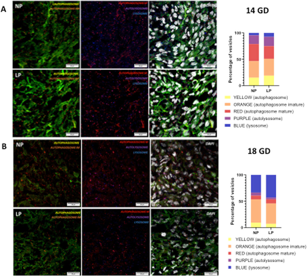 Figure 3. Illustrates the autophagy process at 14 gestational days (GD) (panels (A)) and at 18 GD (panels (B)). Both the NP and the LP offspring groups are shown. The combination of GFP (green fluorescent protein) and RFP (red fluorescent protein) fluorescence produces a yellow signal in phagophores and autophagosomes. In immature autophagosomes, EGFP is quenched, resulting in an orange signal, while mature autophagosomes emit only the RFP signal. Upon fusion with lysosomes, the autolysosome produces a purple signal (indicating RFP + LAMP1). No differences were observed in any of the autophagy vesicles between the two gestational ages.