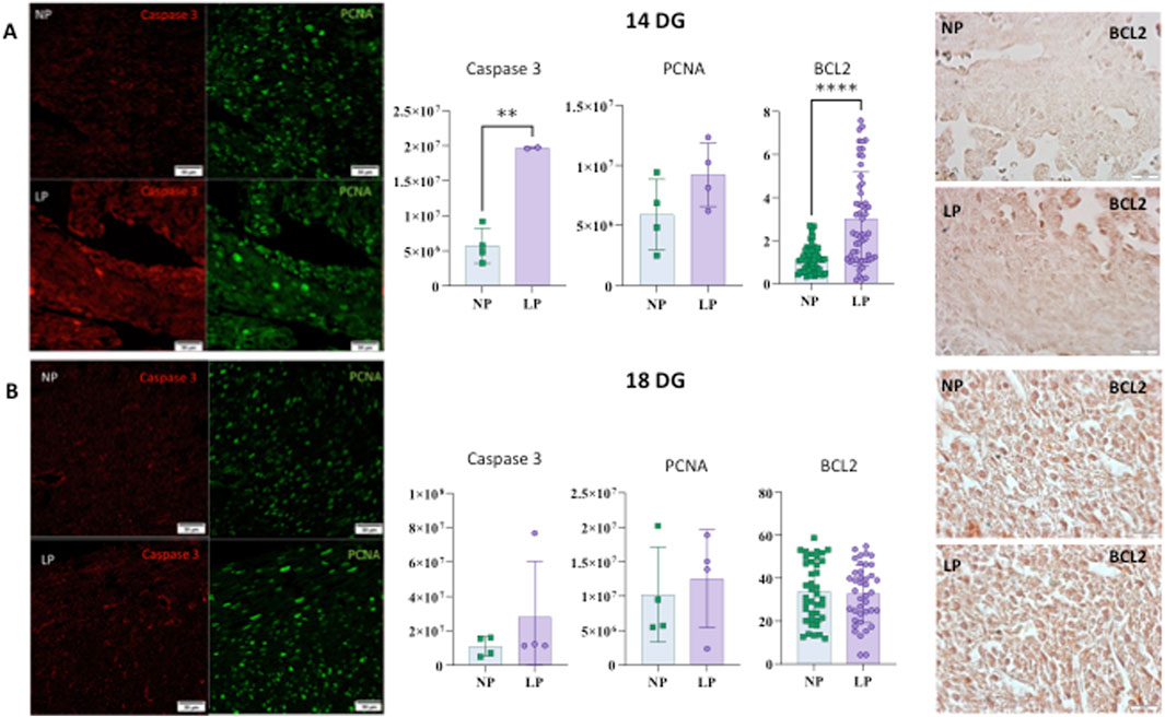 Figure 4. Illustrates the levels of Caspase, PCNA, and BCL2 in the heart at 14 gestational days (GD) (panel (A)). For Caspase-3: NP: 5,753,514 ± 2,511,538 (n = 4) and LP: 19,673,098 ± 121,515 (n = 3), p = 0.0018. For PCNA: NP: 5,899,701 ± 2,943,273 (n = 4) and LP: 9,228,202 ± 2,652,340 (n = 4), p = 0.1439. For BCL2: NP: 1.119 ± 0.6136 (N = 59) and LP: 3.014 ± 2.172 (N = 56), p < 0.0001. (panel (B)) shows the levels of Caspase, PCNA, and BCL2 in the heart at 18 gestational days (GD). For Caspase-3: NP: 10,932,348 ± 5,676,129 (n = 4) and LP: 28,005,548 ± 32,553,962 (n = 3), p = 0.3413. For PCNA: NP: 10,214,501 ± 6,904,684 (n = 4) and LP: 12,527,971 ± 7,116,435 (n = 4), p = 0.6572. For BCL2: NP: 33.86 ± 14.17 (n = 40) and LP: 32.75 ± 13.55 (n = 40) - p = 0.7228.