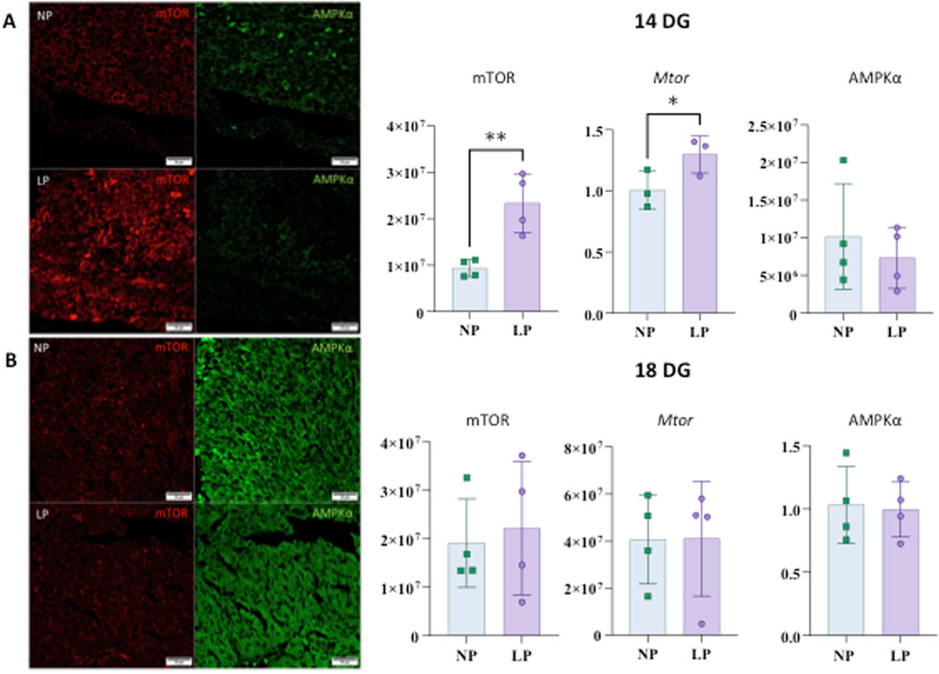 Figure 5. mTOR and AMPKα heart immunostaining at 14 gestational days (panels (A)). The results for mTOR are as follows: NP: 9,323,377 ± 1,848,170 n = 4, and LP: 23,337,483 ± 6,352,528 n = 4, p = 0.0055. For gene expression of Mtor: NP: 1,008 ± 0.1532 n = 3 and LP: 1,297 ± 0.1524 n = 3, p = 0.0407. The results for AMPKα are as follows: AMPKα: NP: 10,162,846 ± 7,037,267 n = 4 and LP: 7,332,373 ± 4,066,103 n = 4, p = 0.5122. Immunostaining to mTOR and AMPKα in the heart at 18 GD (panels (B)). mTOR: NP: 19,110,748 ± 9,139,961 n = 4 and LP: 22,152,485 ± 13,815,193 n = 4, p = 0.7260. Gene expression of Mtor shows NP: 1,031 ± 0.3035 n = 4 and LP: 0.9956 ± 0.2176 n = 4, p = 0.8547. For AMPKα: NP: 40630609 ± 18834851 n = 4 and LP: 41,010,226 ± 24,429,236 n = 4, p = 0.9812.