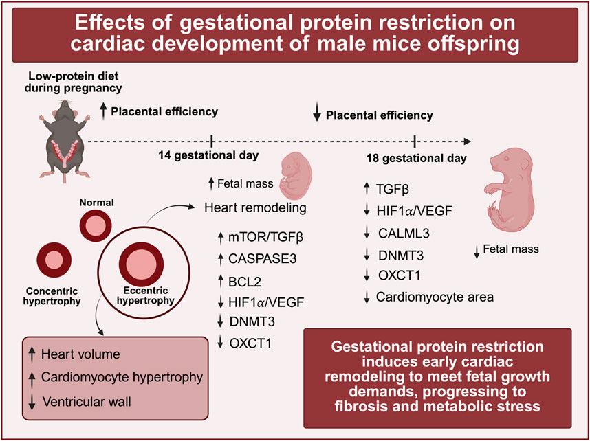 In the present study, mothers assigned to the low-protein (LP) group showed increased food consumption at 18 days of gestation. Nonetheless, this increase did not yield sufficient caloric efficiency, resulting in inadequate weight gain compared to dams in the normal protein intake (NP) group. Similar observations were noted at 14 days of gestation, further supporting the conclusion that mothers on a low-protein (LP) diet experienced diminished weight gain. These findings are congruent with the existing literature, which indicates that gestational protein restriction is associated with reduced weight gain during pregnancy (Desai et al., 1996; Passos et al., 2000; Colombo et al., 1992; Toyomizu et al., 1991; França et al., 2009). Moreover, gestational protein restriction is frequently linked to intrauterine growth restriction and low birth weight (Mesquita et al., 2010a; Mesquita et al., 2010b; Sene et al., 2013; Lamana et al., 2021; Desai et al., 1996). However, our current research offers a novel perspective, illustrating that gestational protein restriction initially results in an increase in body weight, heart volume, and myocyte area in male mice at 14 days of gestation. Nevertheless, by 18 days of gestation, the male mouse offspring subjected to gestational protein restriction exhibit reduced body weights. The current data suggest that, in some instances, limiting maternal protein intake can result in an initial increase in fetal body weight during the early stages of gestation. However, as the pregnancy progresses, this trend frequently reverses, resulting in decreased fetal body weight among protein-restricted groups compared to control groups (Langley-Evans et al., 1996; L et al., 1998; Rees et al., 1999). Such alterations may affect the initial increase in fetal body mass within the placenta, influenced by the secretion of both fetal and maternal hormones. Although the phenotypic plasticity of the placenta may support fetal growth to some extent, its efficiency tends to decline as gestation advances, rendering the fetus more susceptible to the detrimental effects of a low-protein diet, which results in a diminished supply of essential amino acids (Fowden et al., 2009). This study exclusively examined placental mass and did not assess additional placental parameters. The increase in heart volume during development represents a complex and highly regulated process that encompasses various structural and functional adaptations essential for meeting the growing organism’s requirements. This growth primarily relies on an increase in the number of cardiomyocytes, resulting from vigorous cellular proliferation. Hypertrophy also occurs, particularly during intermediate and later developmental stages, in response to hemodynamic and metabolic demands. These processes work together, allowing the heart to expand and adapt functionally to the needs of the developing organism (Li et al., 1996; Porrello et al., 2011; Crispi et al., 2020). The increment in heart volume observed in the low-protein (LP) group of animals at 14 days of gestation may be attributed to hypertrophy, despite no corresponding increase in PCNA expression. The type of hypertrophy present in the heart is intricately linked to the hemodynamic conditions and physiological processes experienced during growth. The heart’s adaptive response can yield two distinct forms of hypertrophy: eccentric hypertrophy and concentric hypertrophy. Concentric hypertrophy occurs when the ventricular wall thickens, directly correlated with the increased load on the ventricle. This form of hypertrophy is more prevalent in scenarios of pressure overload, where the ventricle must exert greater effort to pump blood against increased pressure. Eccentric hypertrophy is predominantly observed during the initial stages of growth and is a physiological response to volume overload. This overload is characterized by an increase in circulating blood volume, particularly as a fetus develops and its metabolic demands escalate. The heart compensates for this elevated volume by undergoing enlargement. In the context of eccentric hypertrophy, ventricular dilation occurs to a greater extent than the thickening of the ventricular walls. This results in a significant increase in the size of the ventricular cavity, but fails to achieve a proportional increase in wall thickness. Furthermore, volume overload can stimulate hypertrophy in cardiomyocytes, subsequently enhancing the heart’s ability to generate force (Mihl et al., 2008; Eghbali et al., 2005). The augmentation of both heart volume and cardiomyocyte area, without a corresponding thickening of the ventricular wall, may facilitate an enhancement in circulating blood volume, thereby supporting fetal growth by approximately 14 days of gestation. Given that the heart is the first organ to develop and attain functionality (Berhrsin and Gibson, 2011; Finnemore and Groves, 2015; Morton and Brodsky, 2016; Tan and Adam, 2020), it is plausible that it completes its proliferative phase earlier than other organs, subsequently adapting through a process of remodeling. Hypertrophy serves as a compensatory mechanism that enables surrounding organs to adjust to their physiological requirements. Initially, cardiomyocyte hypertrophy empowers the heart to generate increased force, thereby meeting heightened demands for blood flow (Li et al., 1996; Porrello et al., 2011; Crispi et al., 2020). However, sustained volume overload can precipitate pathological changes, including fibrosis and compromised heart function. Transforming Growth Factor-beta (TGF-β) plays a crucial role in this transition. While it initially promotes cellular growth, excessive levels can lead to increased extracellular matrix deposition and fibrosis (Dobaczewski et al., 2011; Frangogiannis, 2017). Moreover, elevated levels of the mammalian target of rapamycin (mTOR) may further amplify the effects of TGF-β on fibrotic processes. This enhancement may 