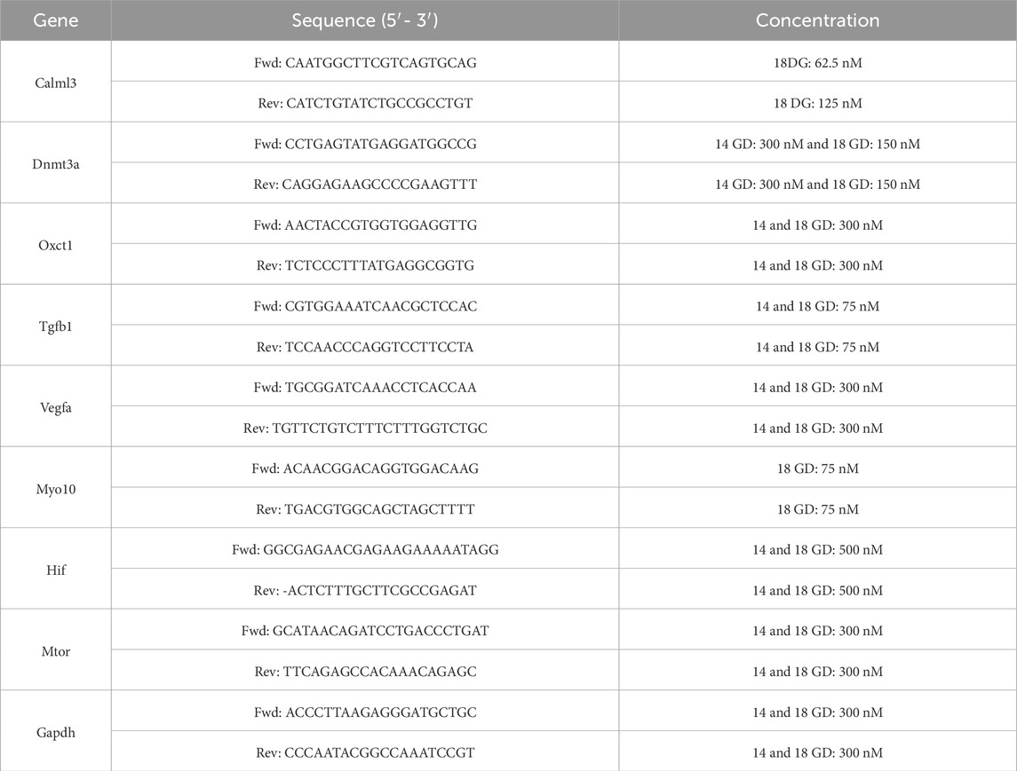 Heart tissues from fetuses at 14 GD (NP n = 3, LP n = 3) were dissected, and RNA was extracted utilizing the RNeasy Plus Micro kit (74,034—Qiagen, Hilden, Germany) according to the manufacturer’s guidelines. The NanoDrop 2000c (Thermo Fisher) was employed to evaluate the purity and concentration of the RNA, accepting samples that achieved 260/230 and 260/280 ratios of ≥1.8. For the heart from animals at 14 GD, complementary DNA (cDNA) was synthesized using 2000 ng of total RNA with the RT2 First Strand kit. For heart from animals at 18 GD, cDNA synthesis was conducted using the High Capacity cDNA Reverse Transcription kit. Primers were designed using the Primer-BLAST tool (NCBI) to span exon-exon junctions (see Table 1). The quantitative PCR (qPCR) cycle was performed with ReadyMix JumpStart™ Taq SYBR® (Cat. No. S4438 – Sigma Aldrich) on a StepOne Plus system under the following conditions: initial denaturation at 95 °C for 2 min, followed by 40 cycles of 95 °C for 15 s, and 60 °C (62 °C for Tgfβ at both 14 and 18 GD, and Calml3 and Myo10 at 18 GD) for 1 min. Data normalization was achieved by correcting Ct values based on the average Ct of the Gapdh.