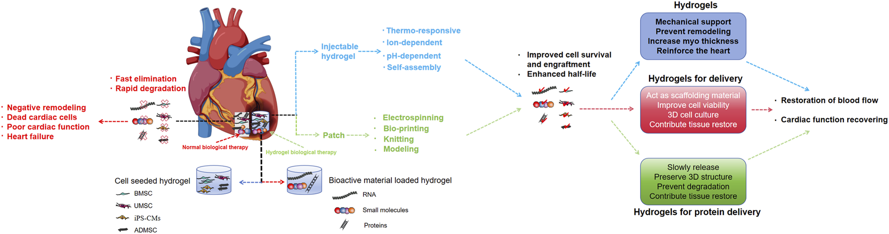 As the foremost global killer, cardiovascular diseases claim more lives annually than any other cause of death (Martin et al., 2024). After myocardial ischemic infarction, necrotic myocardial tissue undergoes three stages: early inflammation, fibrosis, and long-term remodeling. During this period, the infarcted heart wall becomes thinner, and the left ventricle expands, ultimately leading to heart failure. Partial myocardial lesions can also cause changes in cardiac electrical conduction signals, leading to heart failure. Currently, the treatment of heart failure mainly includes three methods: medical therapy, left ventricular assist device implantation, and heart transplantation (Willerson, 2019). Drug therapy is suitable for early mild heart failure and should be actively administered for primary disease. While drugs are essential for managing early-stage heart failure and underlying conditions, often fail to halt or reverse the adverse ventricular remodeling that follows myocardial infarction, ultimately leading to pump function deterioration. For patients with advanced heart disease, mechanical circulatory support with left ventricular assist devices can be life-sustaining. However, the implantation of left ventricular assist devices is expensive and unsuitable for all patients with heart failure. Heart transplantation is the only effective treatment for end-stage heart failure, but its efficacy is limited by factors such as the limited availability of donors and immune rejection after transplantation. In addition, lifelong use of immunosuppressants can increase the risk of infection and malignant tumors (Shah et al., 2019). Therefore, there is an urgent need to develop new treatment methods to promote the repair of the damaged myocardium, thereby improving patient prognosis and quality of life.